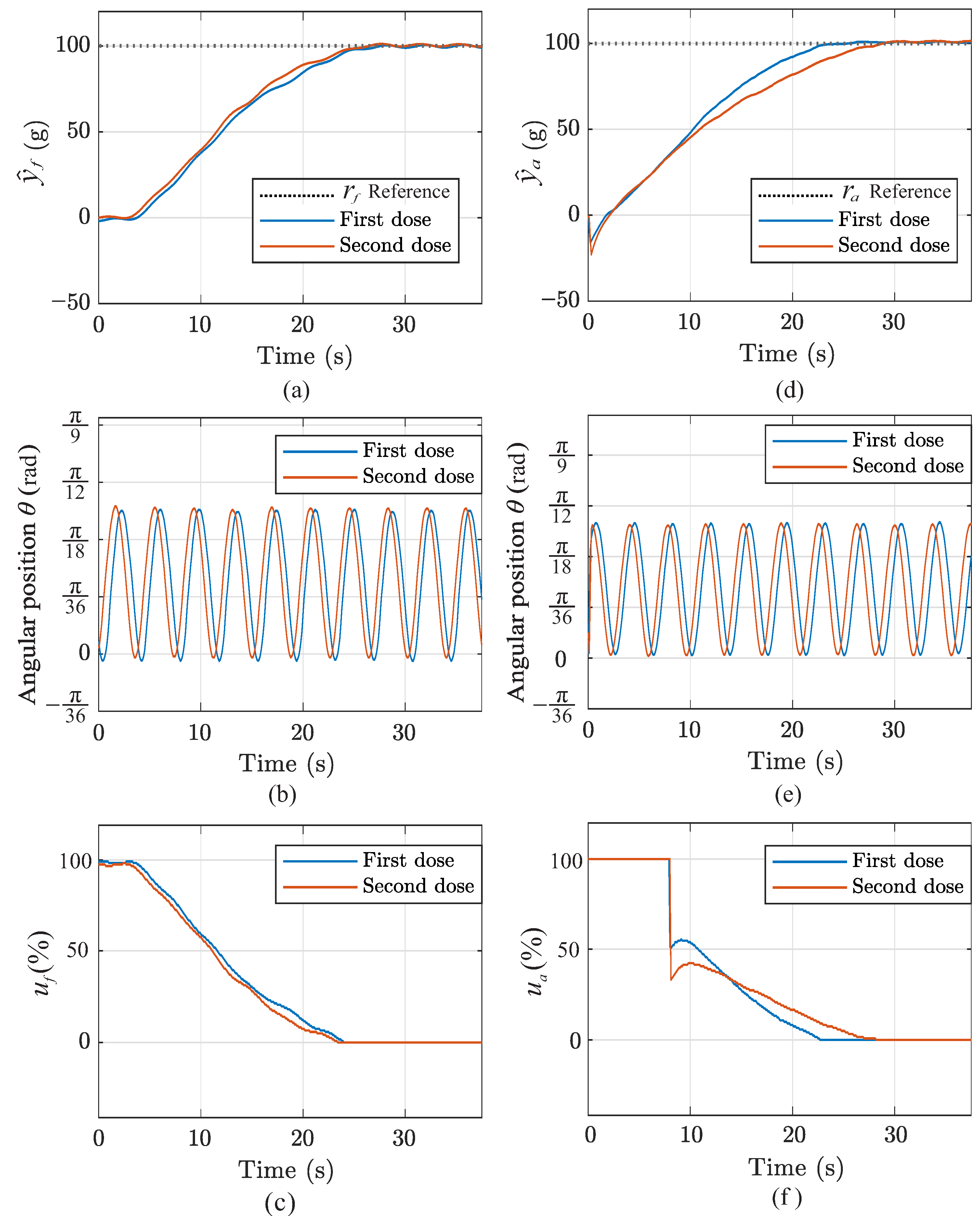 It is important to note that each controller was evaluated over two consecutive dispensing cycles. Although both cycles used the same reference mass, they did not represent repeated trials of identical conditions. After the first dose, the amount of feed stored in the dispenser changed, modifying the load acting on the motor and the mechanical behavior of the system. Evaluating a second dose therefore made it possible to assess the controller’s repeatability under altered operating conditions and to quantify performance degradation when the plant parameters differed from those of the initial cycle. For this reason, the reported “first” and “second” doses correspond to two distinct operating scenarios rather than simple repetitions of the same experiment [