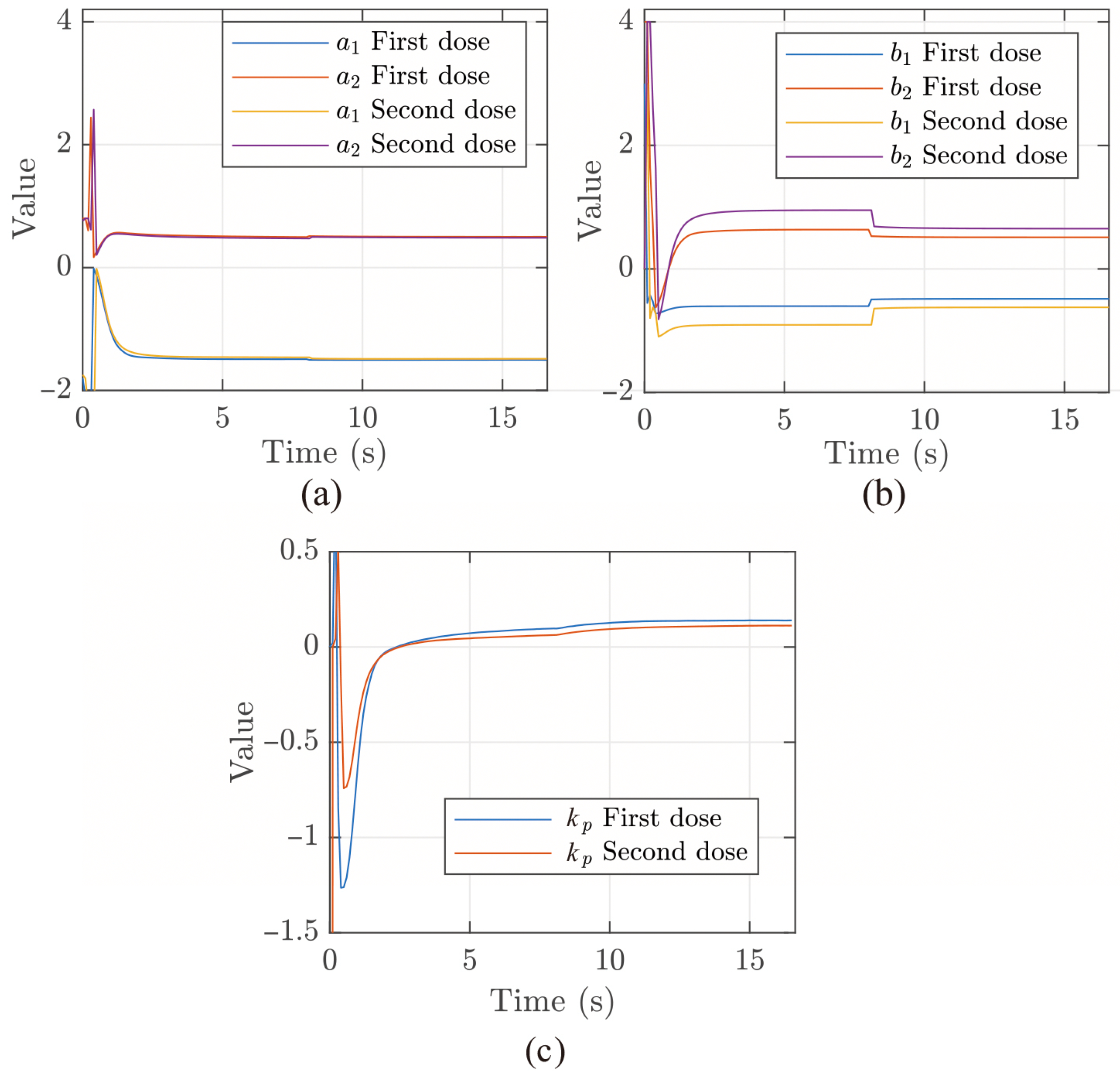 Figure 13, the identification mechanism (RLS) successfully converges after the initialization phase (first 8 s), resulting in stable estimates for the plant parameters