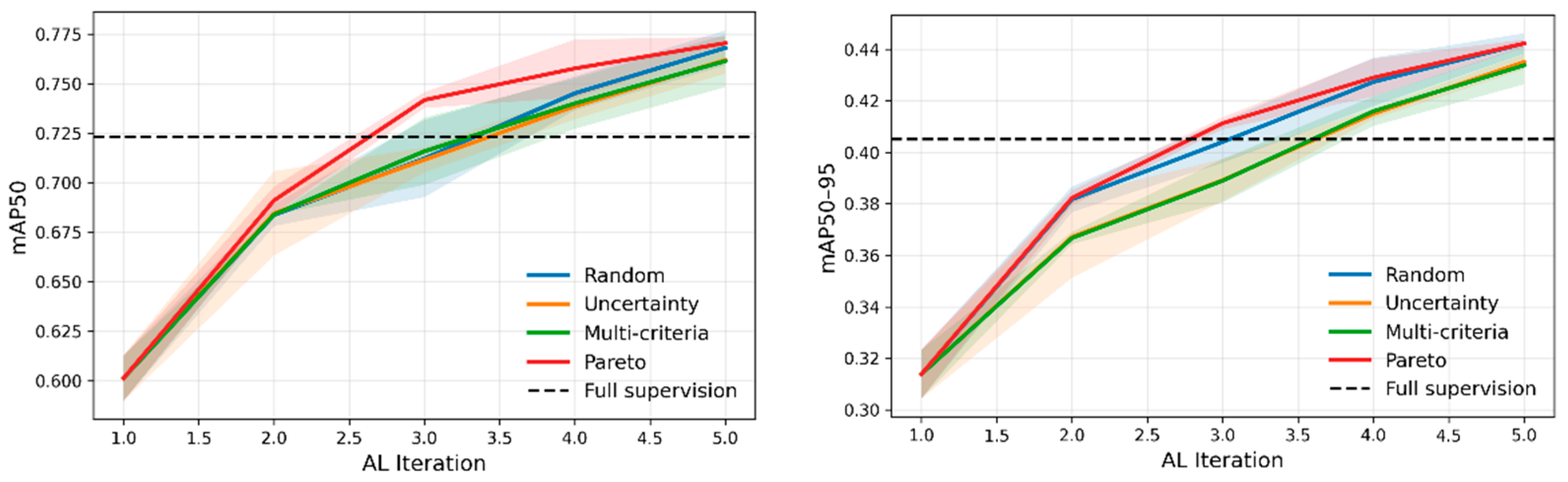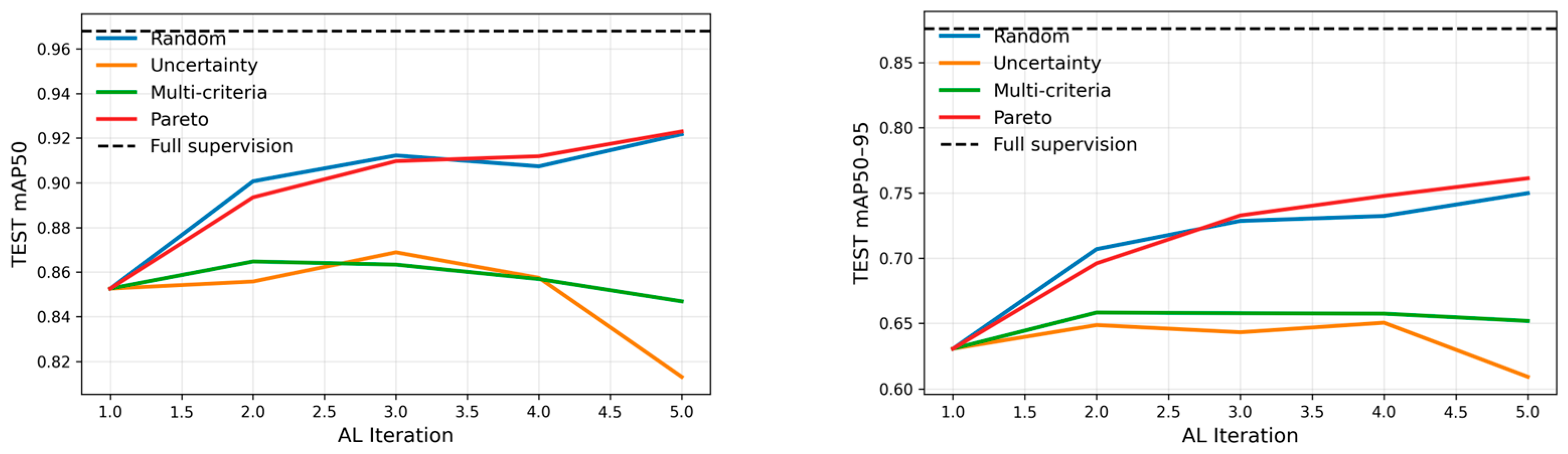 Figure 10 shows the results for Pareto optimization when all criteria were included (equivalent to EW experiments under the scalarized goal function). The experiments demonstrate that Pareto-based selections achieve comparable detection performance while exhibiting lower sensitivity to specific annotation costs than scalarized strategies. In comparison with the scalarized approach, in which all mAP50 curves converge within a 5% range (