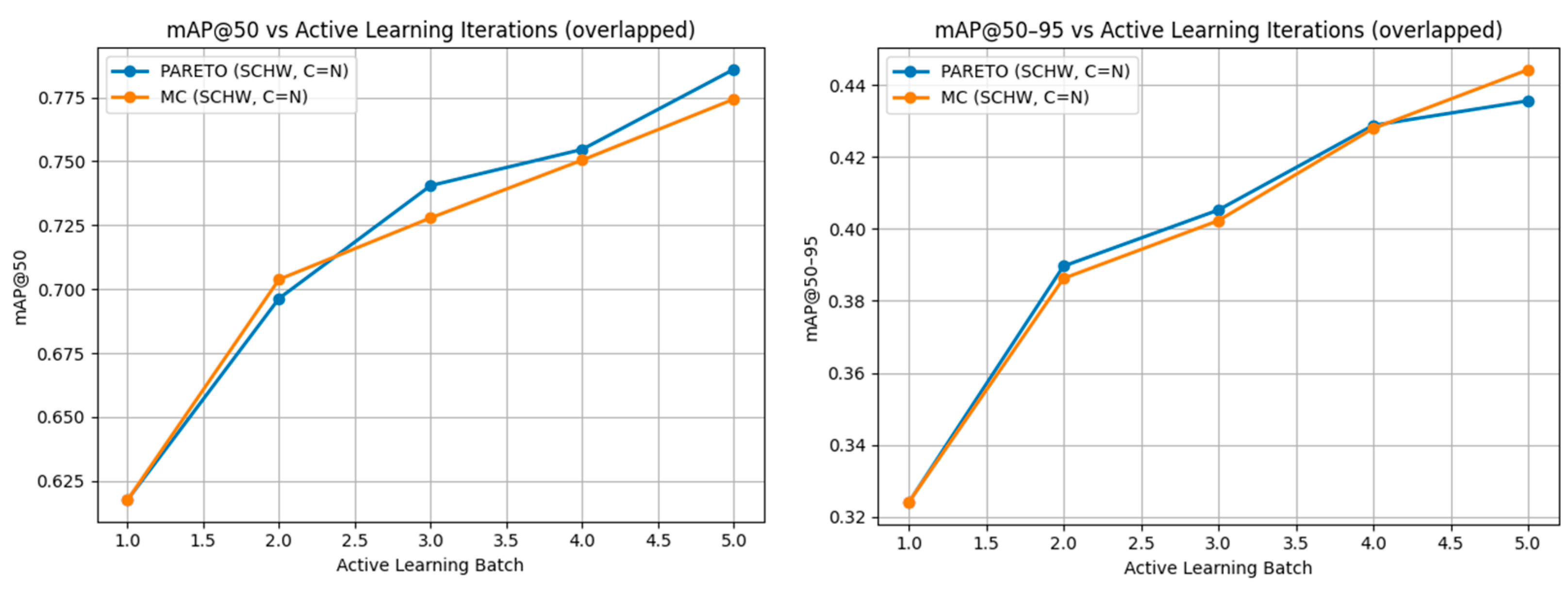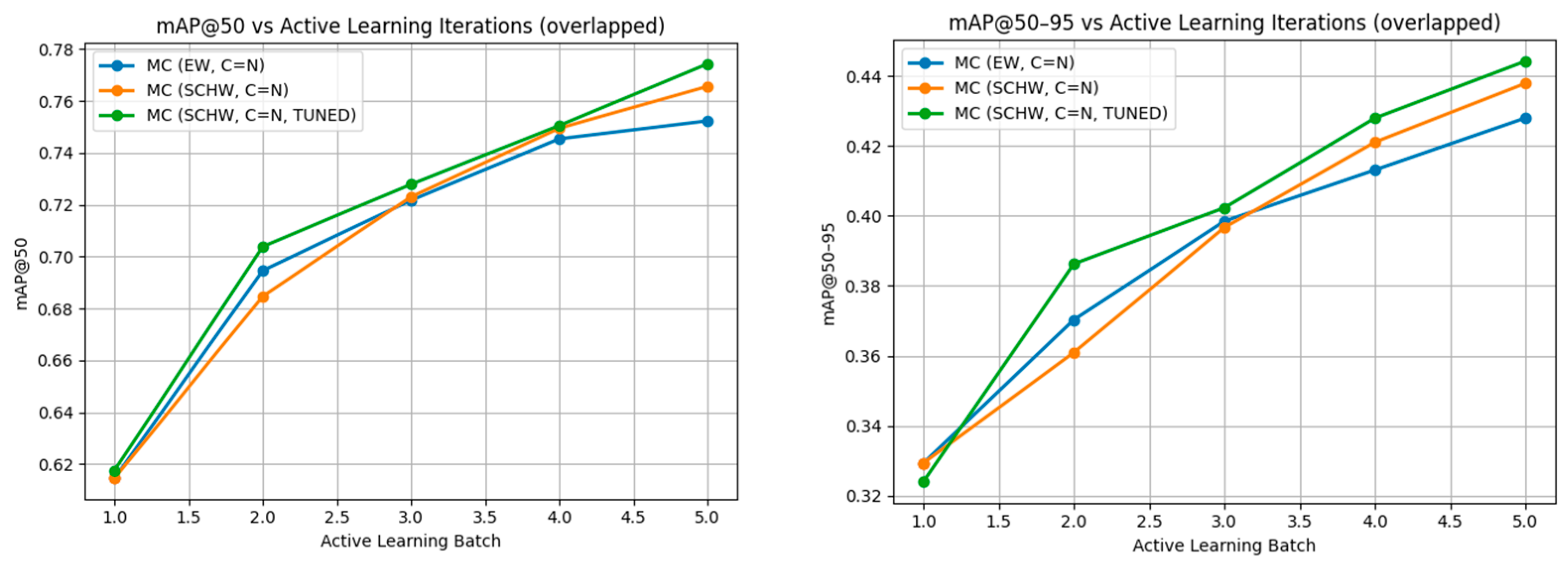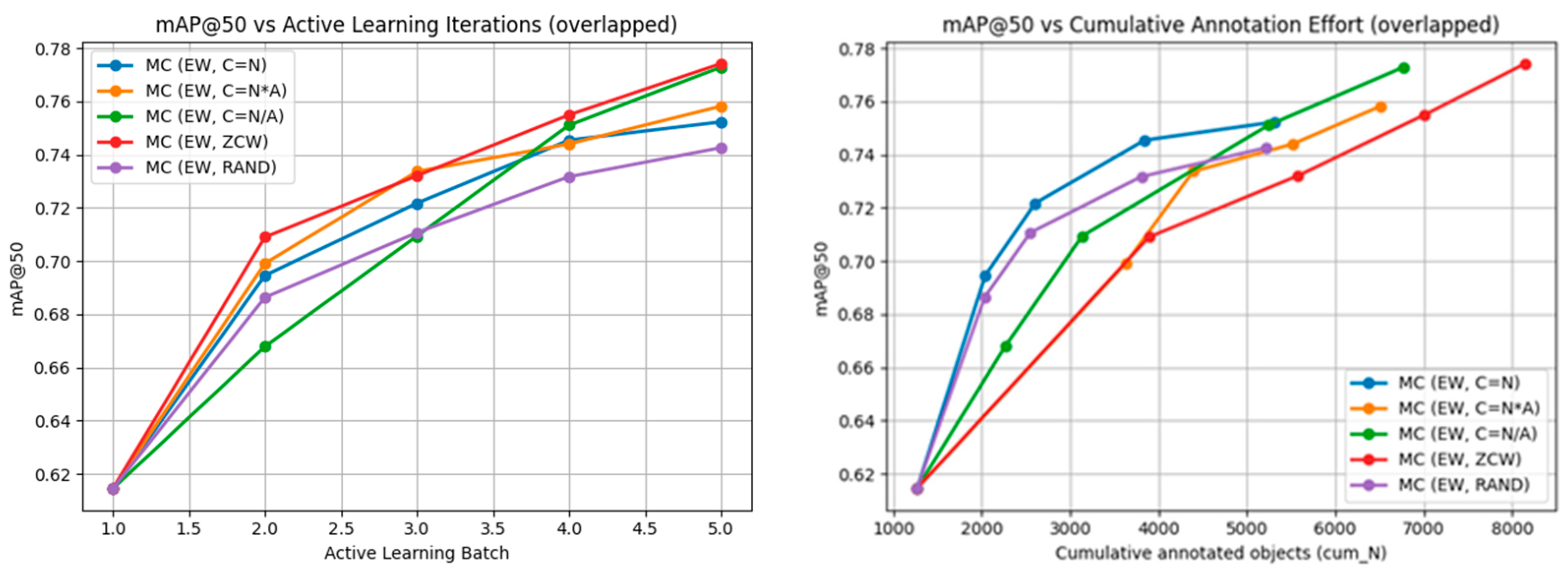 Figure 6, right). Under this effort-based view, the apparent advantage of the ZCW configuration largely disappears. It requires the highest annotation effort to achieve comparable mAP50 levels, indicating lower sample efficiency. In contrast, cost-aware strategies achieve comparable or higher accuracy with substantially fewer annotated objects. This confirms that the superior iteration-based performance of the ZCW configuration observed in