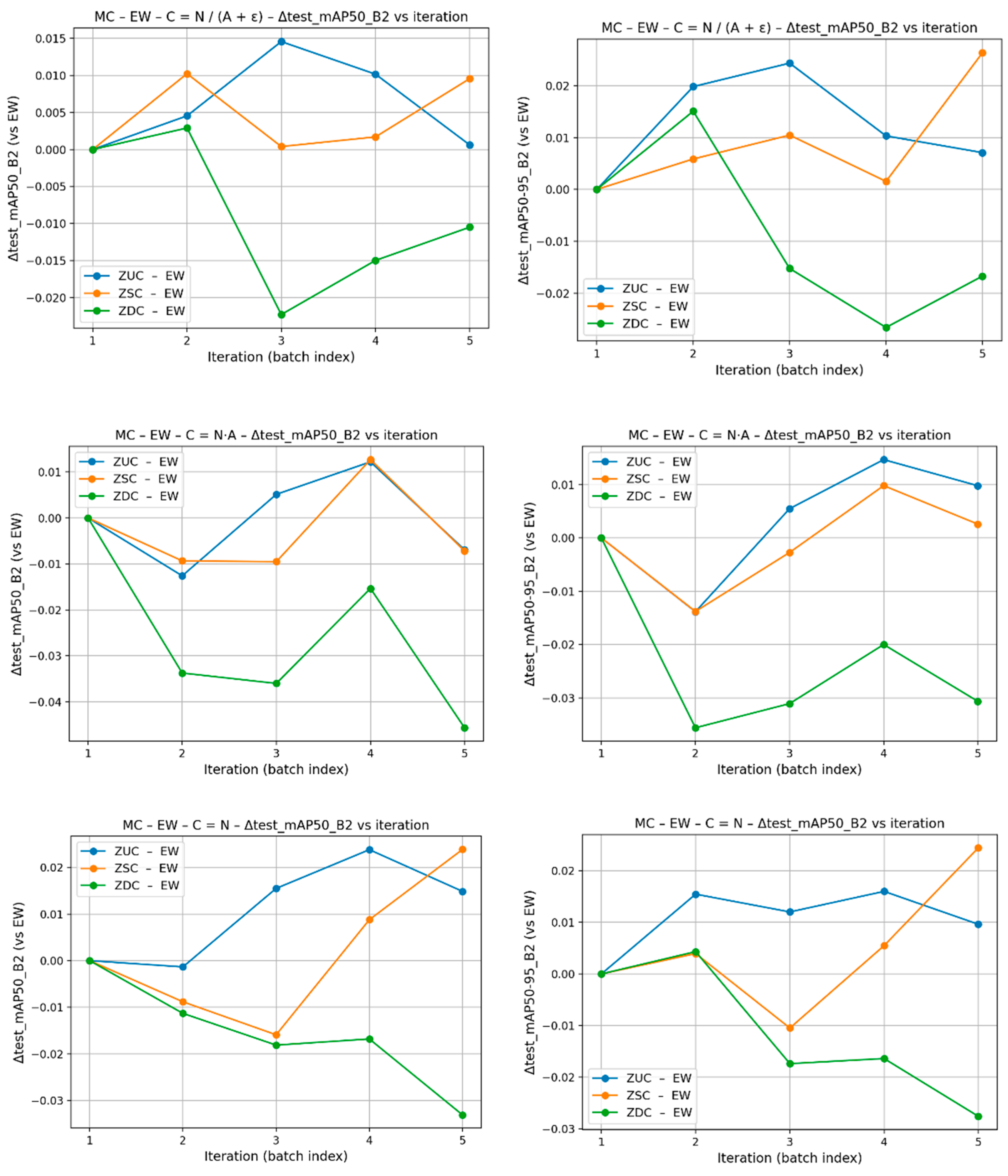 Figure 6 presents results obtained using an equally weighted multi-criteria acquisition strategy for all cost-aware models, together with a random, image-fixed cost model and the ZCW configuration. Performance is evaluated using mAP50 and mAP50–95. The results show that the cost model penalizing dense scenes with small objects (
