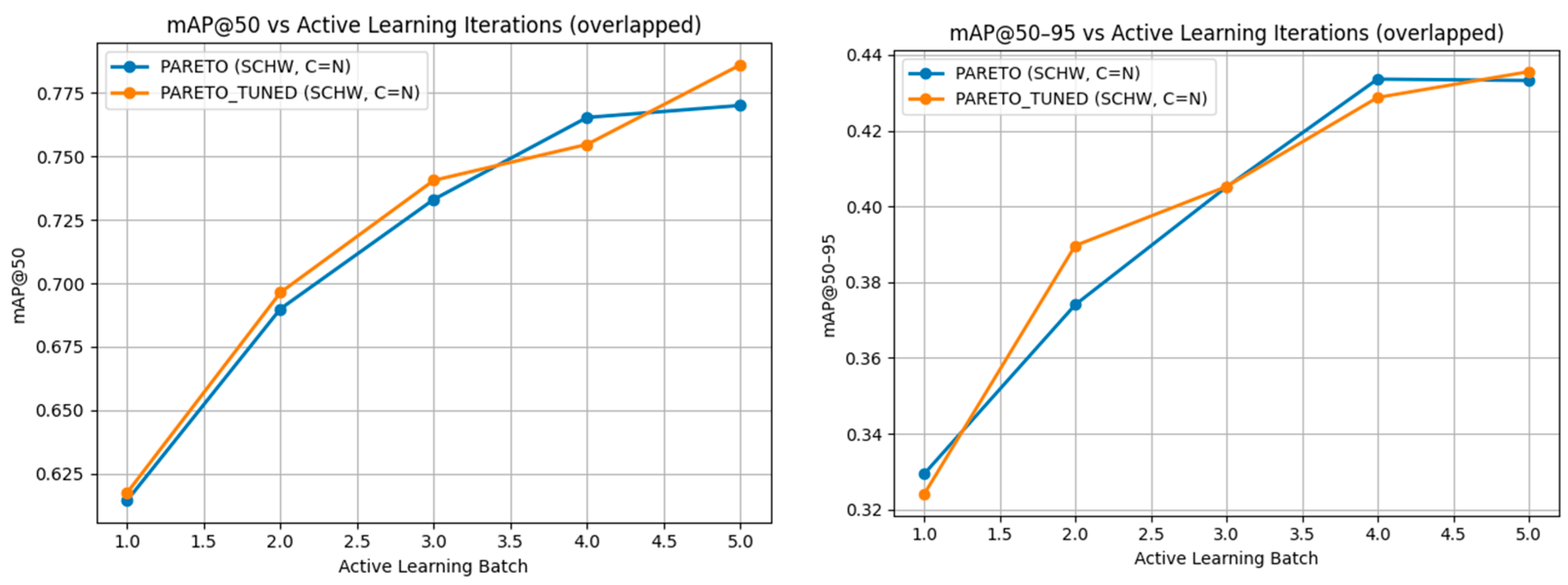 The decreasing Jaccard overlap across iterations demonstrates that the framework meaningfully shapes acquisition behaviour rather than collapsing into a single dominant signal. At the same time, the convergence of detection performance across scalarized and Pareto strategies indicates that the underlying difficulty structure of dense orchard imagery can be exploited through multiple, cost-regularized acquisition paths. Direct comparisons with many recent active learning frameworks are difficult because most approaches target classification tasks or rely on different detector architectures and dataset protocols.