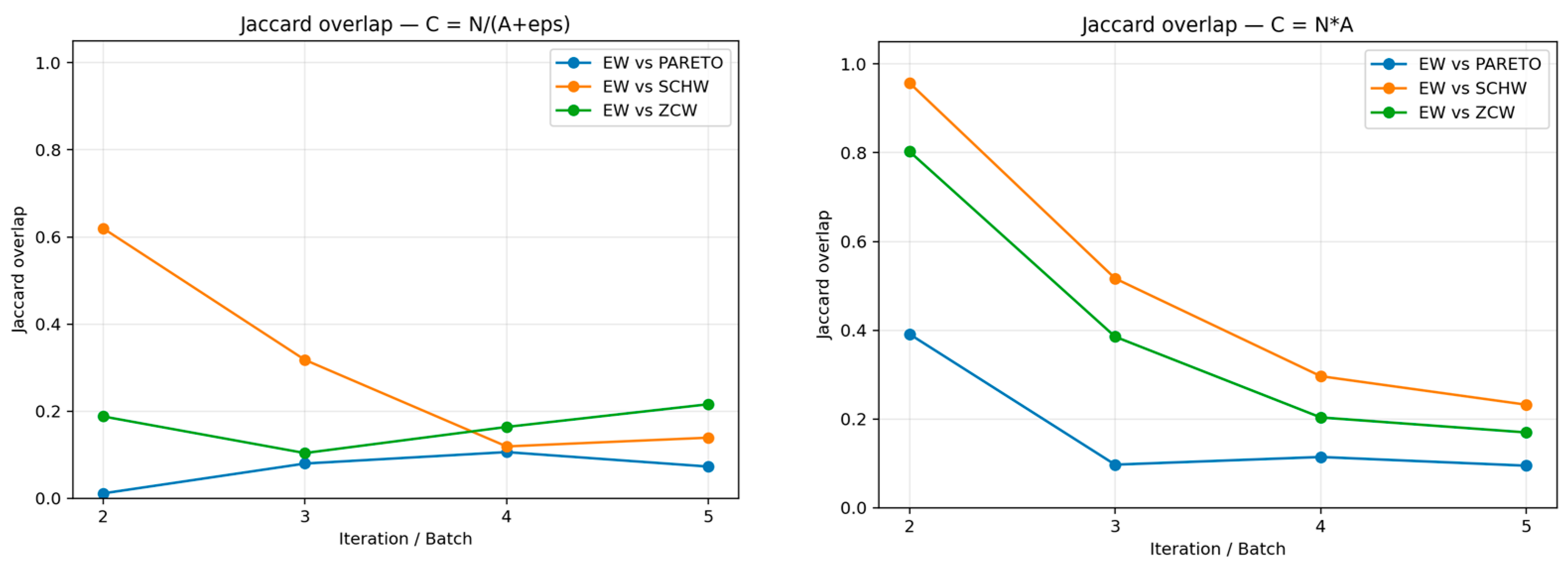 For real-world annotation workflows, Pareto-based selection offers a safe default strategy: it delivers competitive detection performance without requiring precise cost calibration, while allowing practitioners to identify and discard cost formulations that do not induce consistent or interpretable selection patterns. However, to justify the weighting logic of individual criteria, a similar procedure was applied to Pareto optimization. Because Pareto optimization considers all criteria simultaneously, the weights applied to the scalar form do not affect it. With Pareto, a minor influence of a criterion can be simulated by excluding that criterion from the optimisation procedure. Therefore, for the cost model C = N, the form of Pareto optimisation was adjusted in batches, as shown in