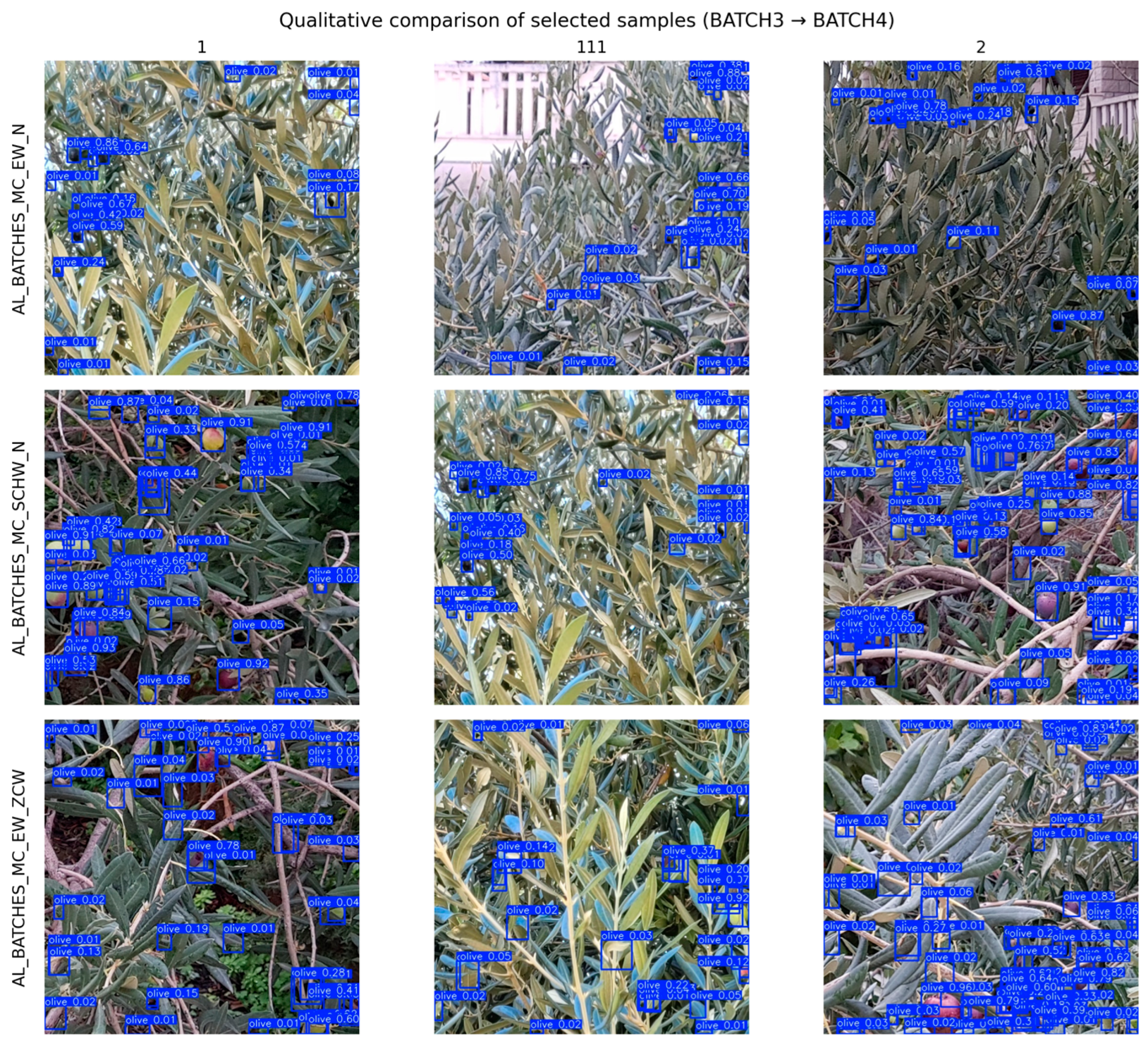 YOLO predictions are overlaid on each image to visualize the density, scale, and spatial distribution of detected olives. These qualitative examples correspond to measurable differences in the underlying acquisition signals, including prediction uncertainty , small-object relevance , scene density , and estimated annotation cost . The comparison illustrates that cost-aware strategies (MC-EW and MC-SCHW) tend to select scenes that balance object density and annotation workload, whereas the cost-free configuration (MC-EW-ZCW) more frequently selects scenes dominated by numerous small and low-confidence detections. Despite these differences in visual characteristics, the resulting training samples provide comparable supervision for the detector, consistent with the convergence behaviour observed in the quantitative experiments.