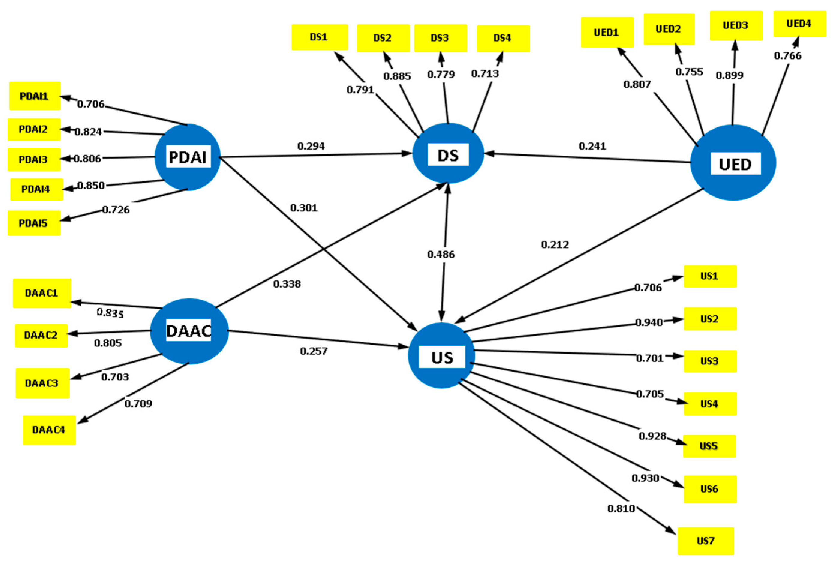 Table 4 indicate that this condition is satisfied for all constructs, as the diagonal values (PDAI = 0.788; UED = 0.809; DAAC = 0.770; DS = 0.796; US = 0.824) exceed the corresponding inter-construct correlations. These findings confirm both the conceptual and empirical distinctiveness of the latent dimensions included in the model.