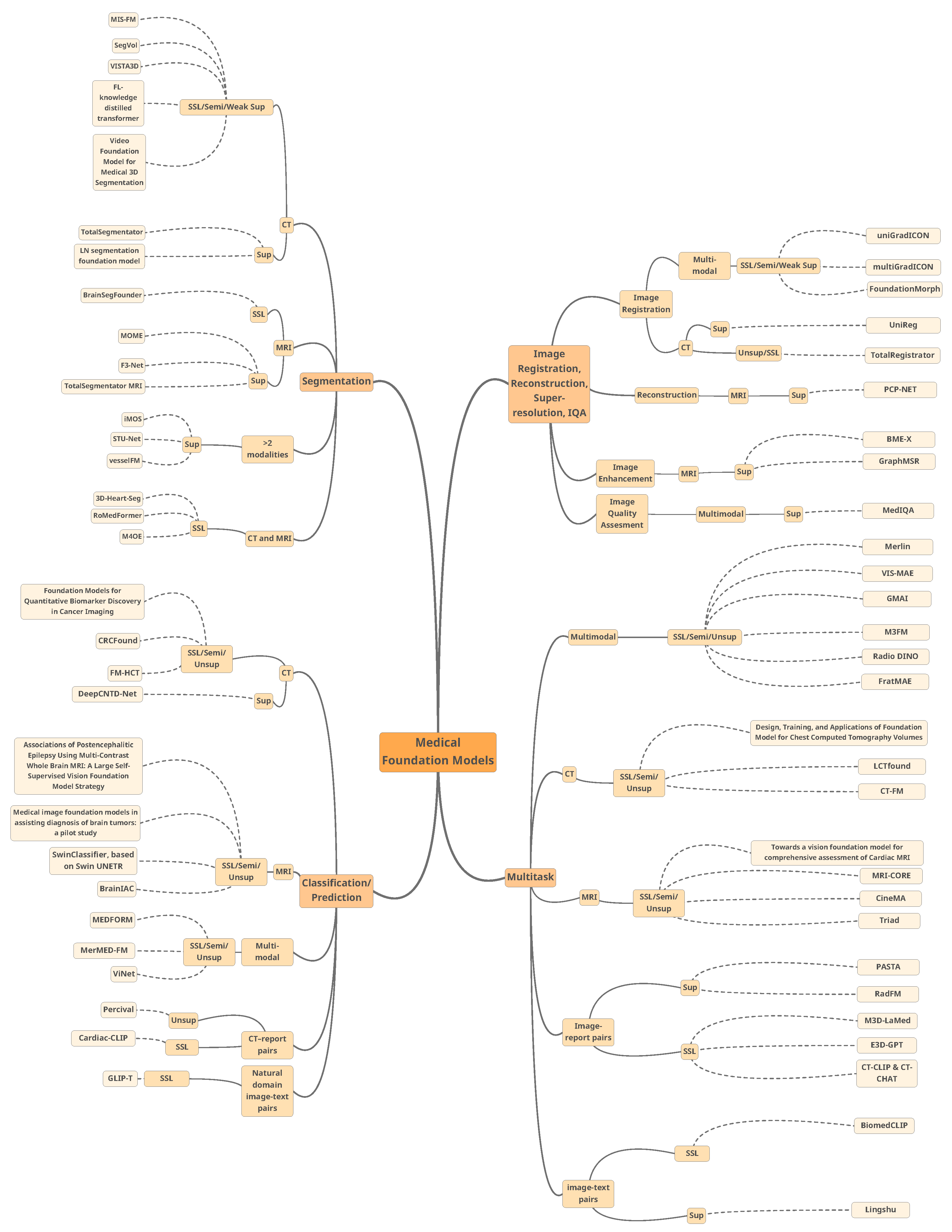 | [108] | 2025 | LCTfound | V | CT | 28M slices | PR | Lung, mediastinum, bronchi, arterial, venous networks | Classification, segmentation, prognosis, prediction, virtual imaging, reconstruction, enhancement | U-Net with transformer blocks | SSL | Denoising diffusion probabilistic models |