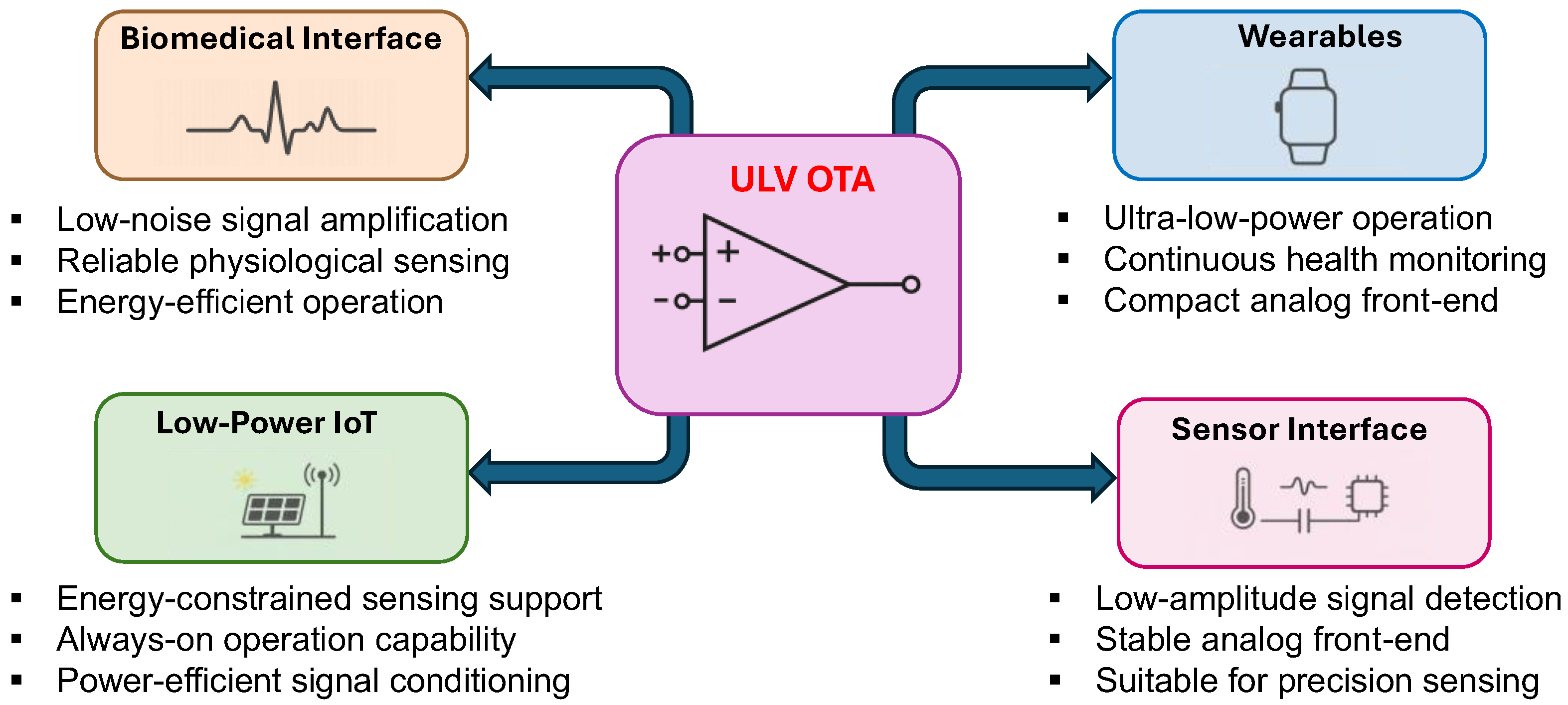 Biomedical applications represent another domain that can significantly benefit from ULV OTA. Owing to their low-frequency characteristics and stringent power consumption requirements, ULV circuits are well-suited for biomedical devices. For instance, in Gm–C filters commonly used in electrocardiogram (ECG) and electroencephalogram (EEG) signal conditioning, the OTA serves as the core building block. In [