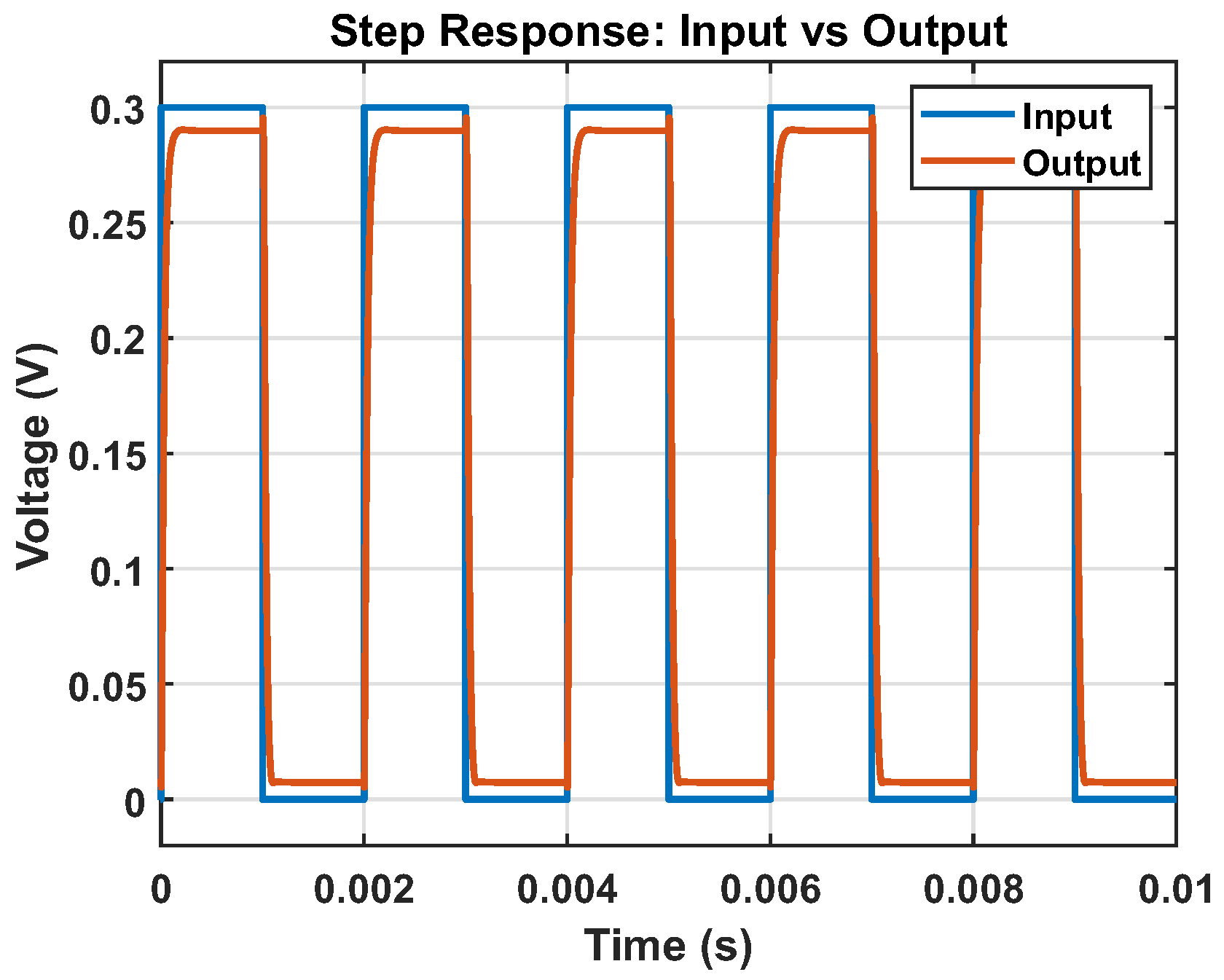 Figure 4 presents the step response of the proposed OTA when driving a 30 pF load capacitance. The output of the OTA swings from 10 mV to 290 mV, achieving an output swing utilization of 94%, which demonstrates a near rail-to-rail output capability. The input common-mode voltage is swept from 0 mV to 300 mV.