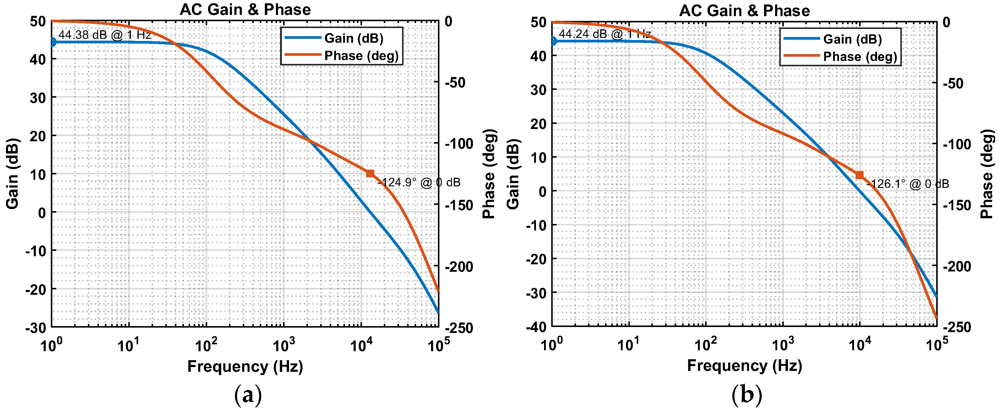 Figure 5b shows the post-layout simulation results. The phase margin decreases from 55.11° to 53.93° after layout. Such a reduction in phase margin is a common phenomenon in post-layout simulations, as the introduction of parasitic capacitances associated with the transistors shifts the locations of system poles and zeros, thereby degrading the alignment of the compensation network and reducing its effectiveness. This effect is particularly pronounced when using MMZCC, where pole–zero cancellation is highly sensitive to alignment accuracy, leading to a noticeable degradation in phase margin after layout.