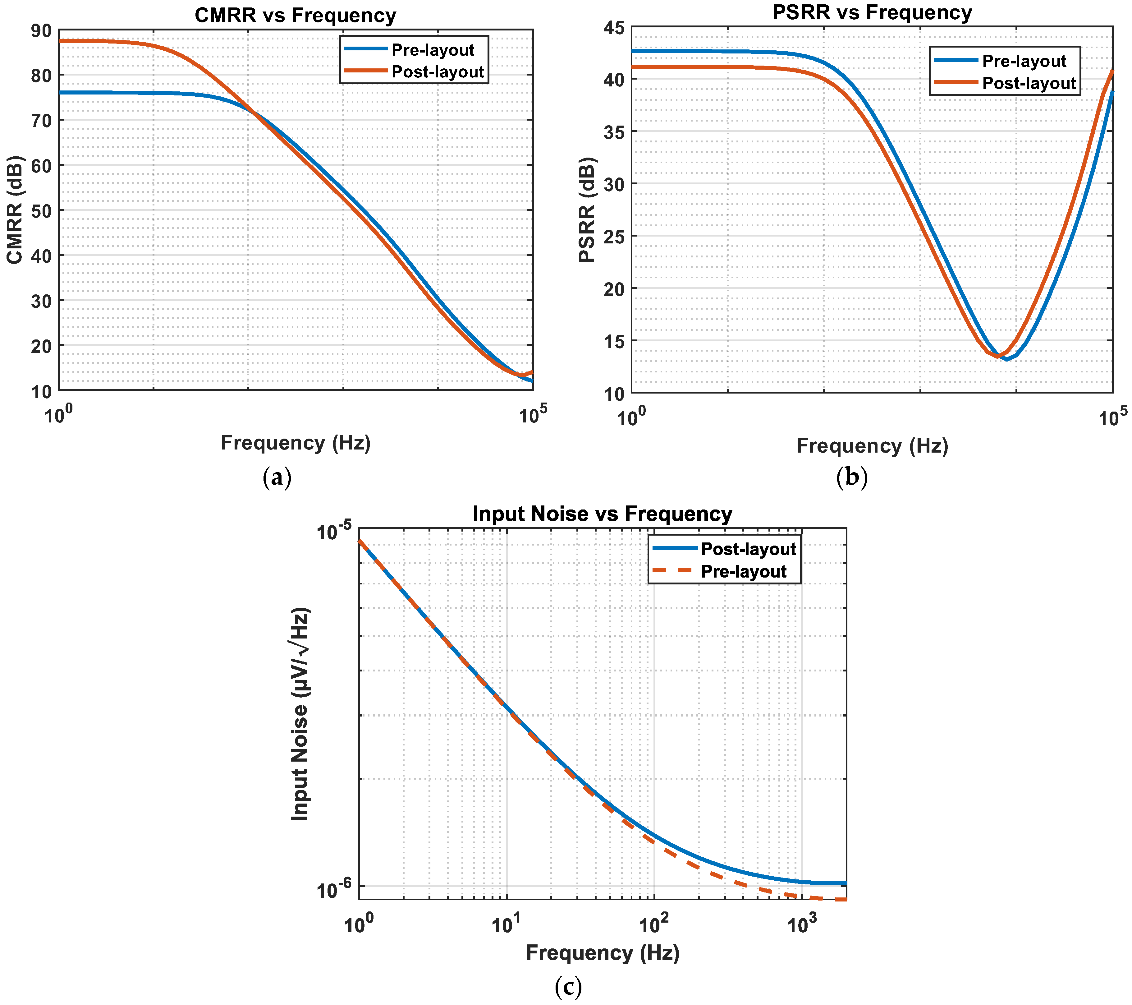 Figure 6a compares the pre-layout and post-layout CMRR. The CMRR is 76.01 dB in the pre-layout simulation and increases to 87.48 dB in the post-layout simulation, corresponding to an improvement of 11.47 dB. The post-layout result is obtained from parasitic-extracted simulations without device mismatch, and the CMRR is reported at 1 Hz. Further explanations will be given in the following section.