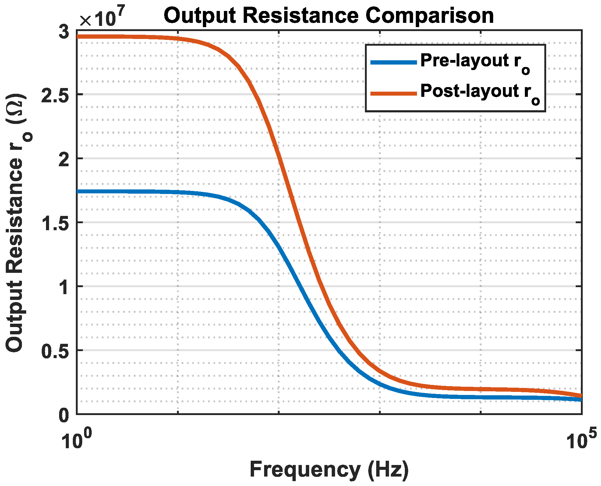 Figure 7 compares the output impedance of the proposed OTA obtained from pre-layout and post-layout simulations. It can be observed that the output impedance increases significantly after layout, which is consistent with the previous analysis. The increase in output impedance directly contributes to the observed improvements in CMRR.