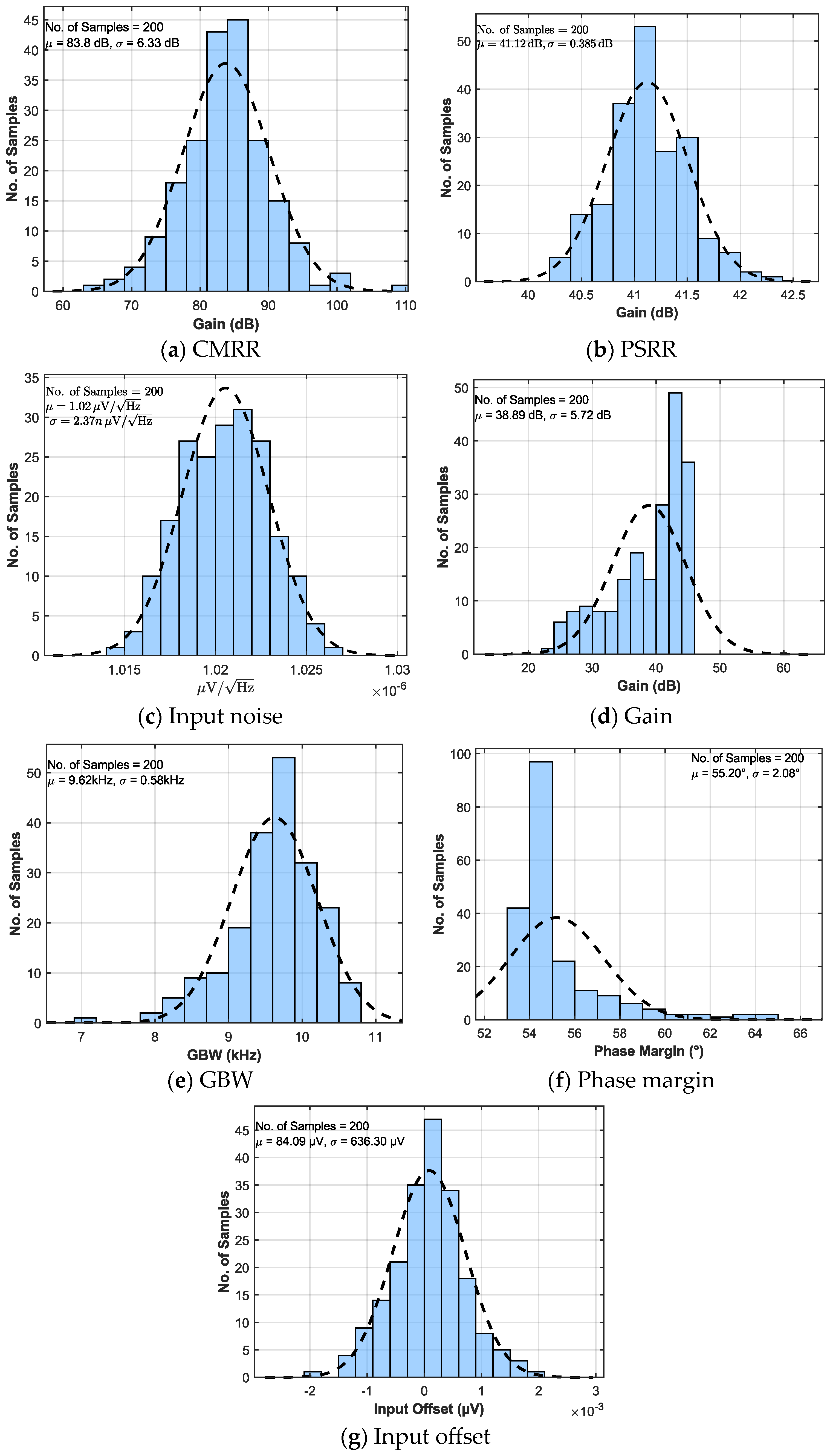 Figure 9 presents the Monte Carlo simulation results for 200 samples, performed with the “ALL” variation option that encompasses both global process variations and local mismatch. For PSRR, variations with a standard deviation below 3 dB are regarded as not significant, a criterion comfortably satisfied, indicating that the amplifier’s rejection of supply noise remains robust despite device mismatch. Similarly, input-referred noise exhibits exceptional stability, with a standard deviation of only 2.37 nV/√Hz. This minimal variation confirms that the noise performance, fundamentally determined by the input pair’s transconductance and thermal noise contribution, is well-controlled even under mismatch, representing a critical attribute for biomedical applications where signal integrity is paramount.