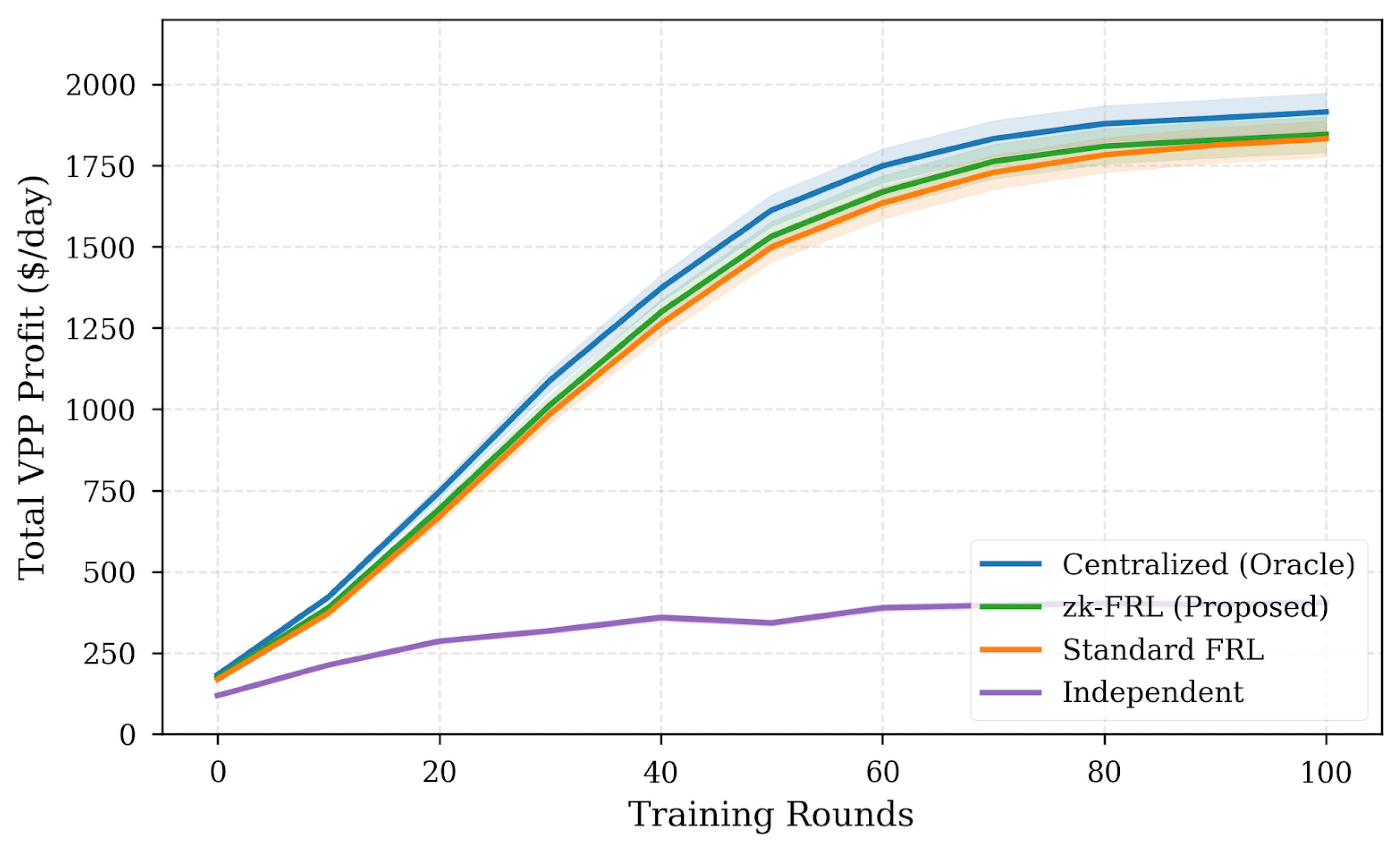 Beyond algorithmic performance, the framework supports a verifiable governance model for VPP operation. Because aggregation integrity is enforced cryptographically rather than procedurally, DER owners can participate without granting raw-data visibility (measurements and local experience trajectories) to a central coordinator, and operators can demonstrate protocol compliance without requiring access to those raw data streams. At the same time, the zk-SNARK layer enables independent verification that the published global model follows the prescribed aggregation rule over the declared round data; the framework targets verifiable aggregation integrity rather than concealing model updates from the aggregator. This property is aligned with emerging requirements for auditable control in critical infrastructure and suggests a pathway toward coordination mechanisms that avoid raw-data centralization while remaining independently verifiable.