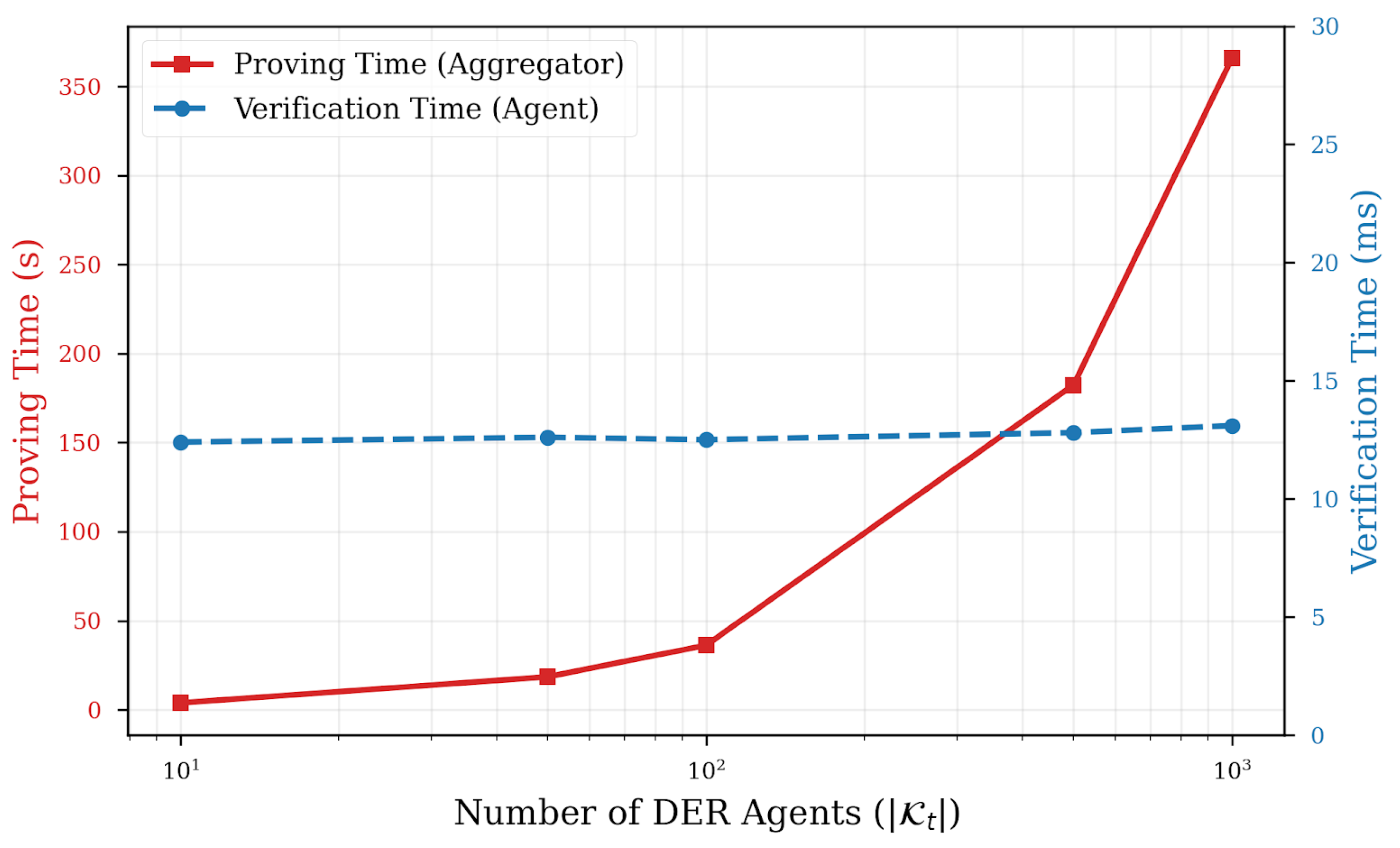 parameters, the measured proof generation time at the aggregator increases approximately linearly with the number of participating DERs, while the verification time at each DER remains lightweight and largely insensitive to fleet size. This verifier/prover asymmetry is a key advantage of zk-SNARKs: even resource-constrained DER devices can independently audit aggregation integrity with low latency. In our implementation, proving is performed at the federated-round time scale and does not block the sub-second physical control loop, since DERs continue operating with the last verified parameters until a valid global model is available.