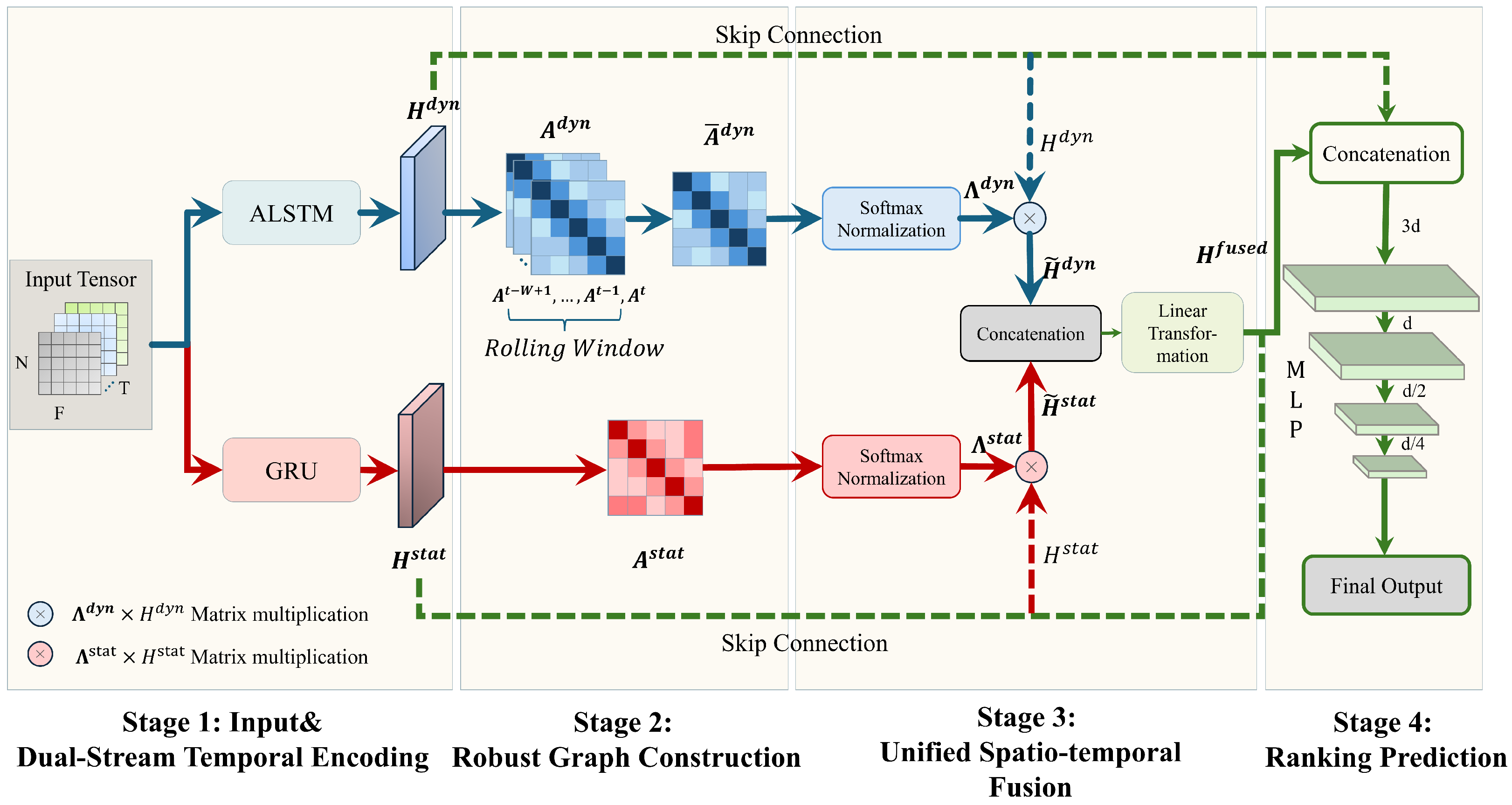 - We build a shared fusion layer to aggregate dynamic and structural relations within one downstream prediction pipeline, while skip connections retain the original temporal features.