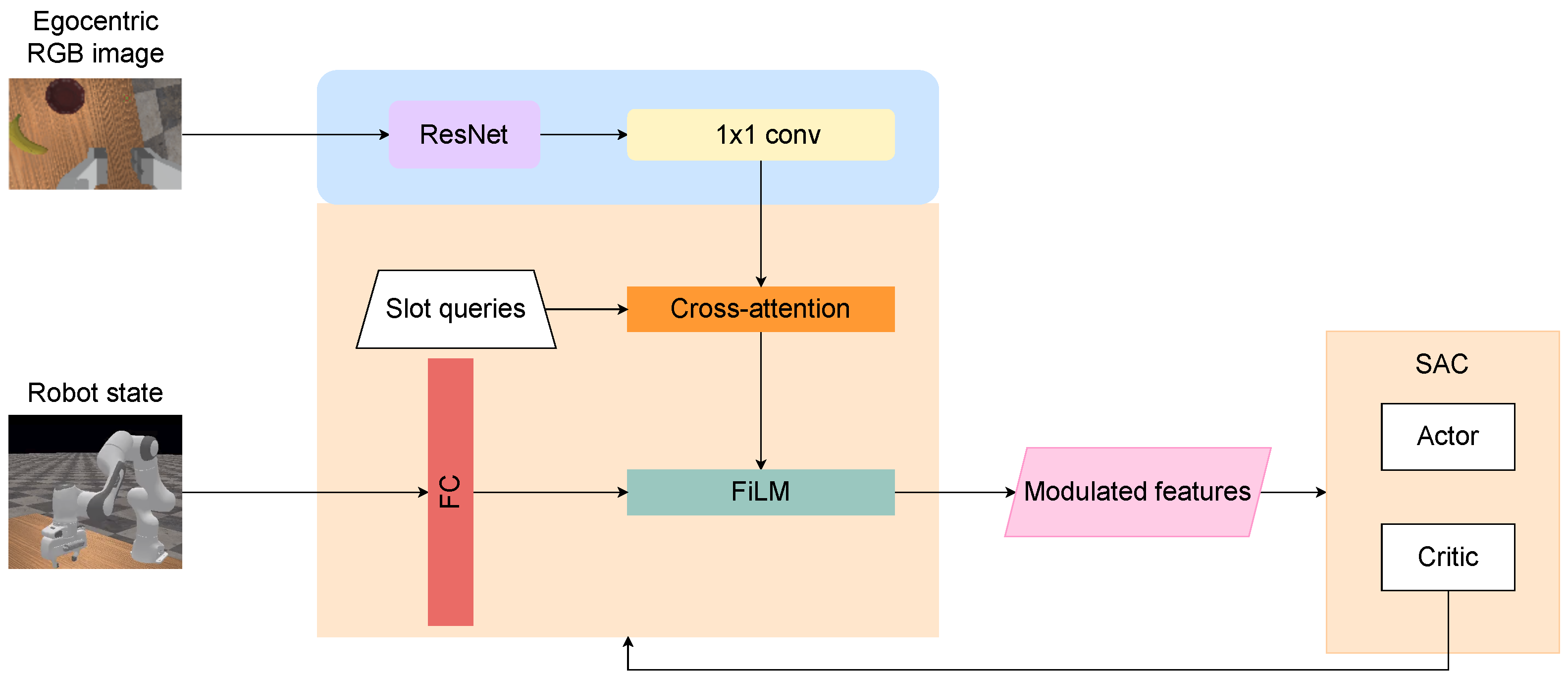 Overview of the proposed proprioception-modulated architecture. Egocentric RGB input is encoded via ResNet and tokenized. Learnable slot queries attend to the tokens using a cross-attention mechanism. The resulting slot features are modulated by the robot states via FiLM and shared across all SAC components for policy learning. During reinforcement learning, the beige background modules, including FiLM conditioning, state projection, cross-attention, and slot heads, remain trainable and receive gradients from the SAC critic, while the blue background modules are frozen.