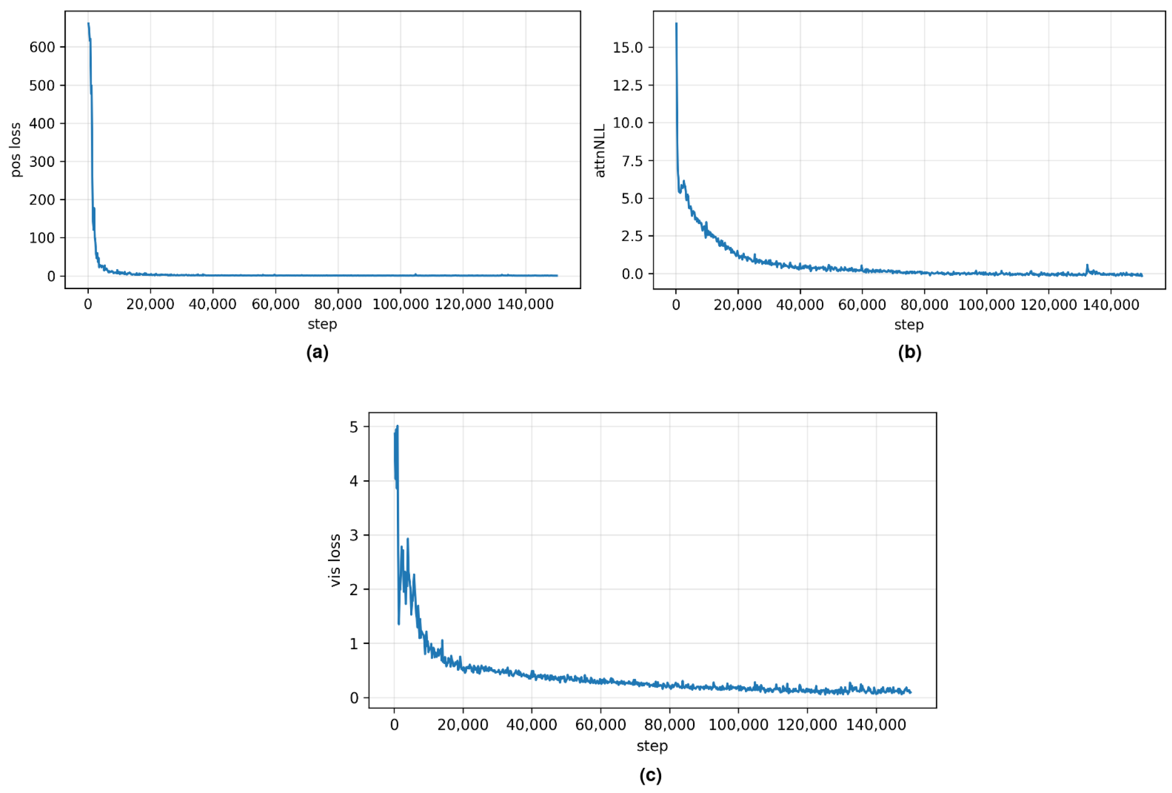 Pre-training loss components for the egocentric slot-based encoder. (a) Swap-invariant pixel-space UV regression error (pos), (b) attention alignment loss (attnNLL), and (c) visibility prediction BCE (vis loss) over pre-training steps on PickBanana. All losses decrease rapidly and stabilize, indicating accurate pixel localization, attention centered on projected object tokens, and robust visibility handling in the wrist camera view.