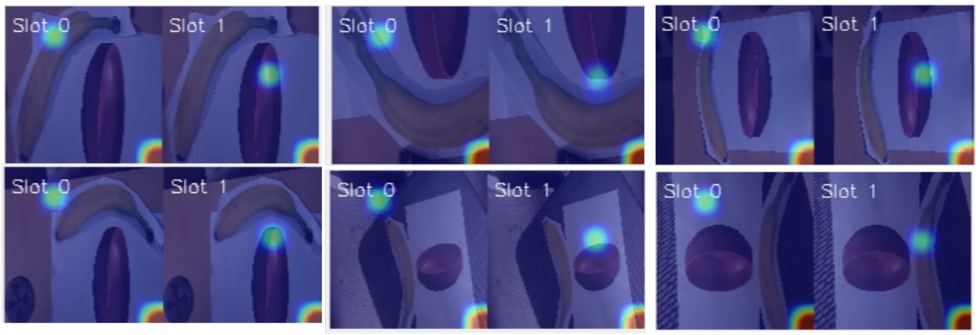 Slot specialization from egocentric attention. Random frames illustrate the original observation (orig) and the attention heatmaps for Slot 0 and Slot 1. Across diverse viewpoints and object configurations, the two slots form a consistent decomposition in which one slot attends to the banana and the other to the bowl, with rare identity permutations expected from permutation-invariant slot learning without explicit slot–object binding. When both objects are fully occluded, attention reverts to the end-effector region as an agent-centric fallback cue.