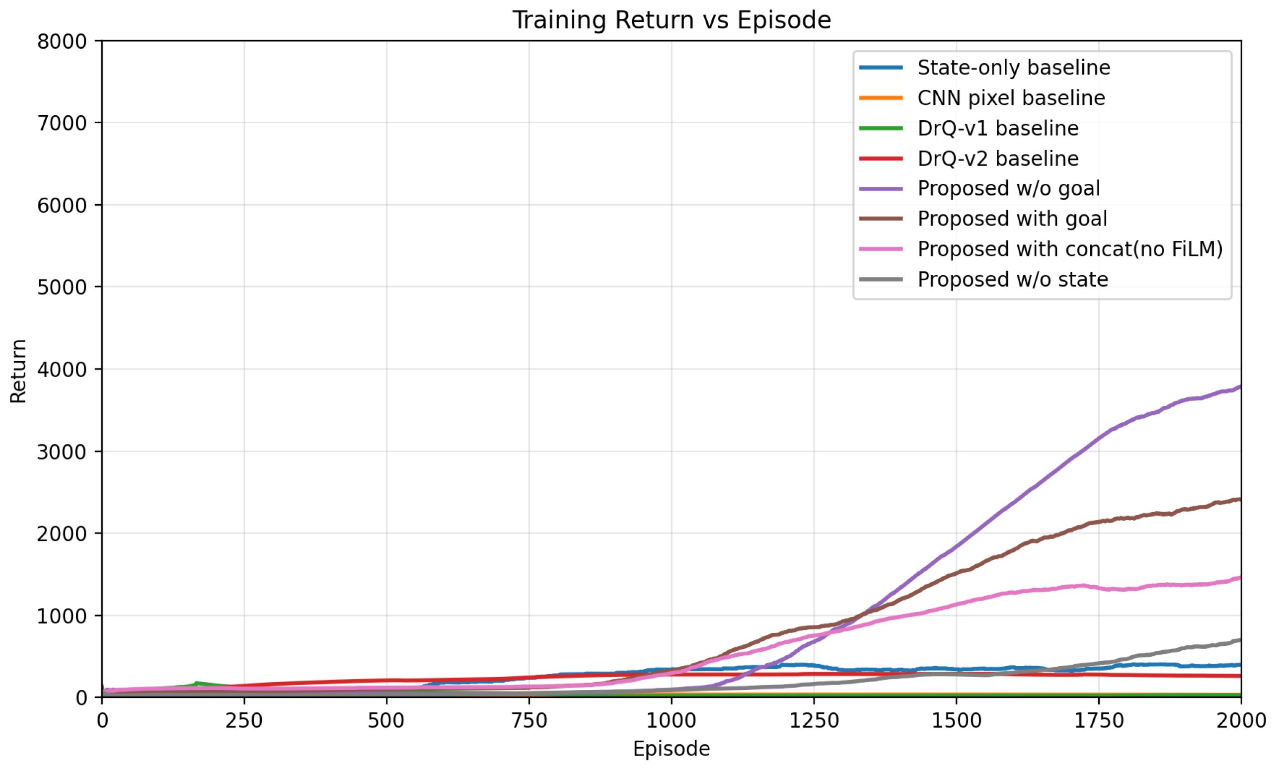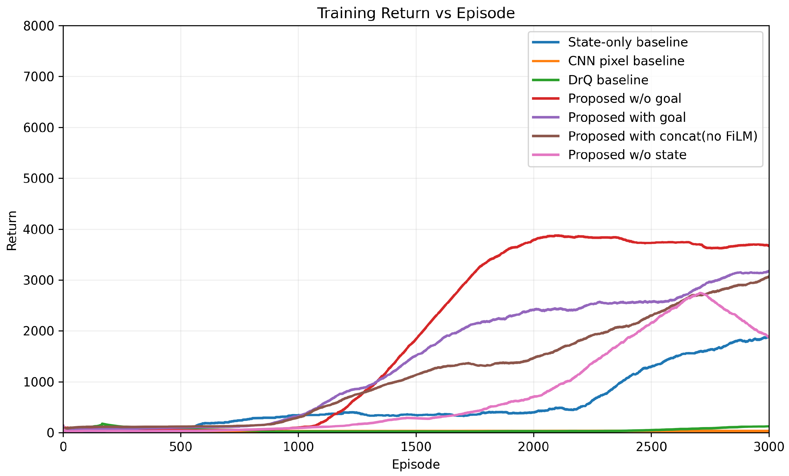 Training return over 3000 episodes for all baselines and ablations under the same reward scaling. The proposed multi-slot attention agent consistently outperforms pixel-only and state-only alternatives, and the ablations isolate which design choices drive this gap.
