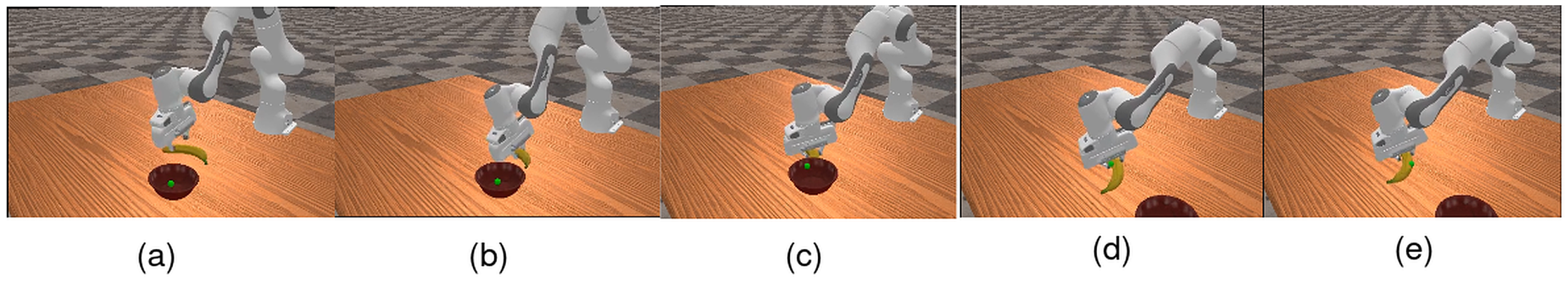 Manipulation behavior (left to right) (a) reaching toward the banana; (b) grasping (c) lifting, transporting and pushing bowl; (d) place at target position (e) hold at the target position.