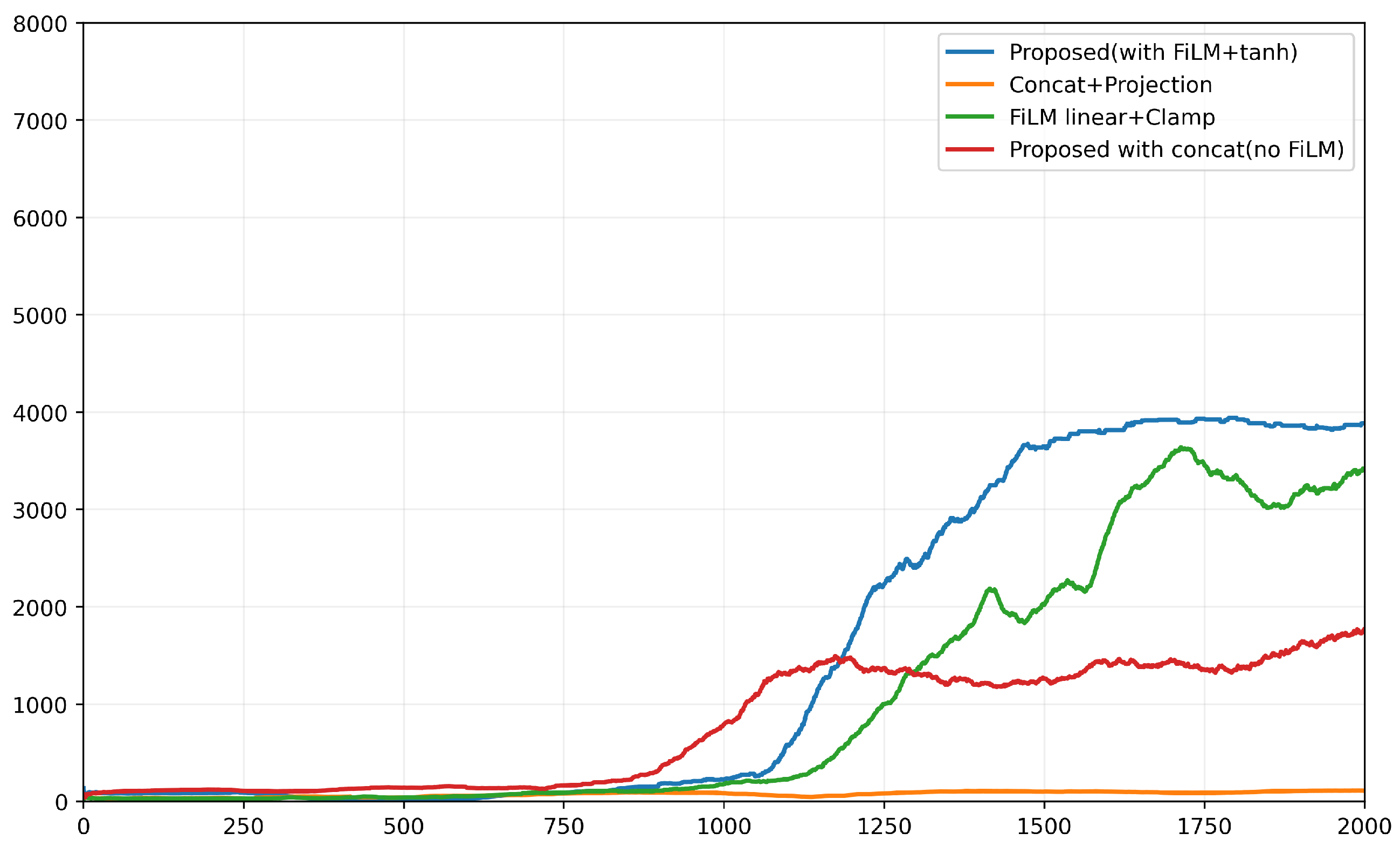 Training curves comparing FiLM with tanh modulation (proposed), FiLM with linear+clamp, concatenation with projection, and concatenation without FiLM.