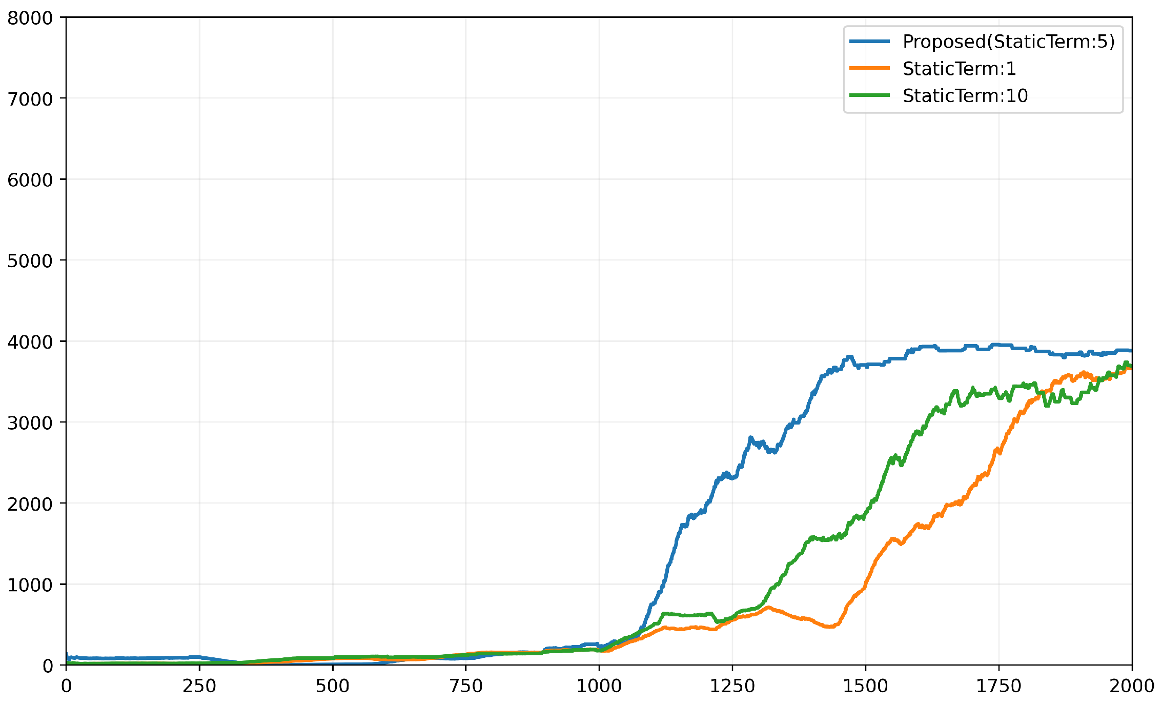 Training return across 2000 episodes for different velocity penalty scaling terms. The proposed setting (StaticTerm = 5) achieves faster learning and higher stable return compared to StaticTerm = 1 and StaticTerm = 10.