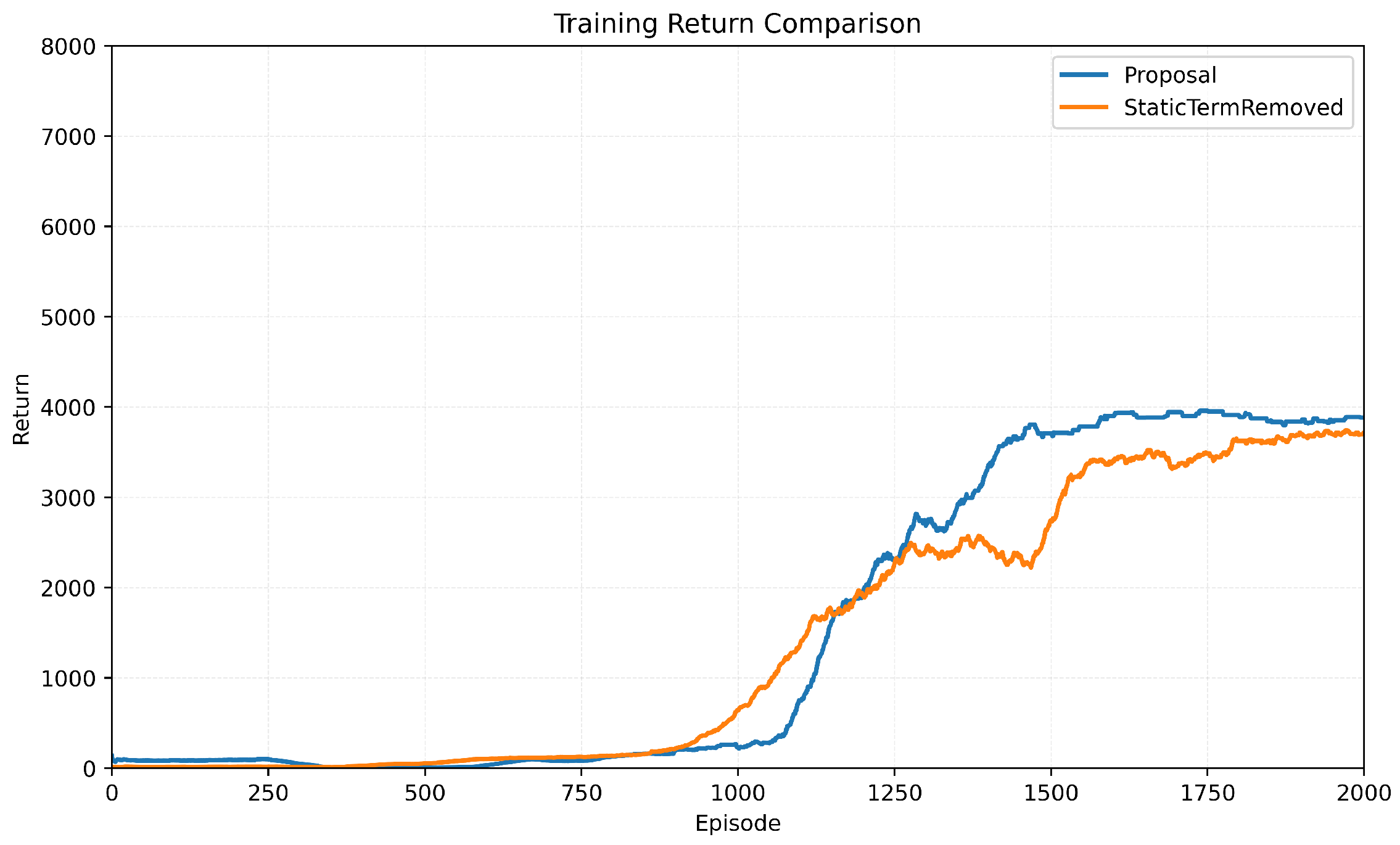Training return across episodes comparing the proposed method with the static reward term and the variant where the static term is removed.