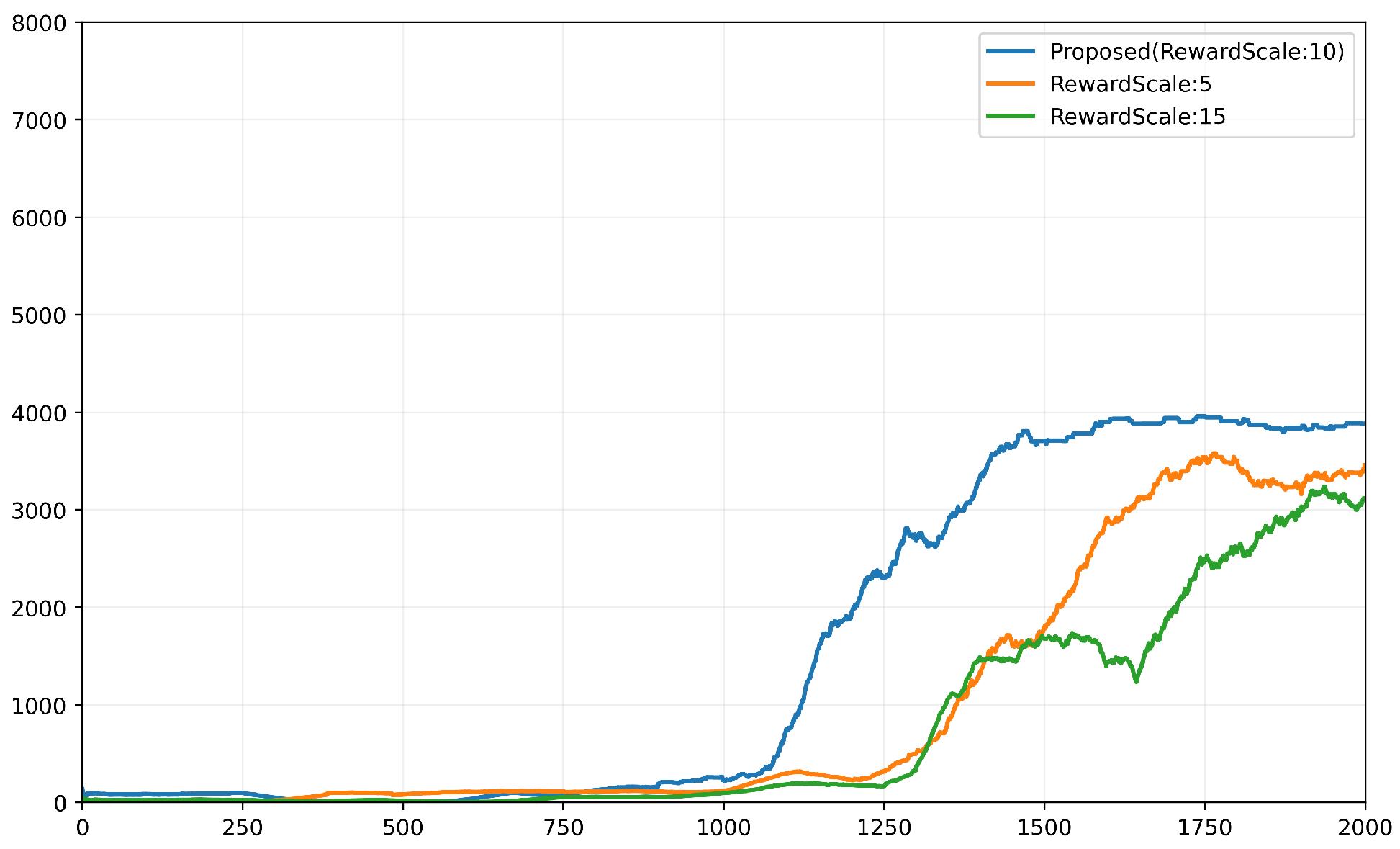 Training return across 2000 episodes for different reward scaling factors. The proposed variant (RewardScale:10) achieves faster performance improvement and a higher final return compared to RewardScale:5 and RewardScale:15.