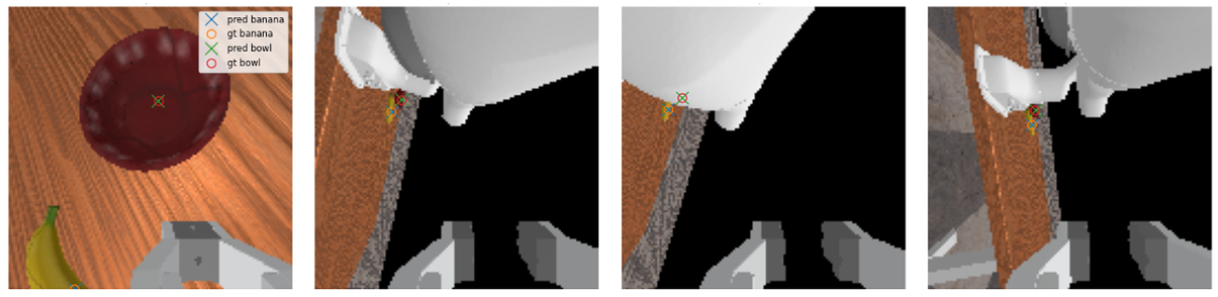 Position prediction under surplus slot configuration (). Predicted and ground-truth keypoints for the banana and bowl are overlaid across different viewpoints.
