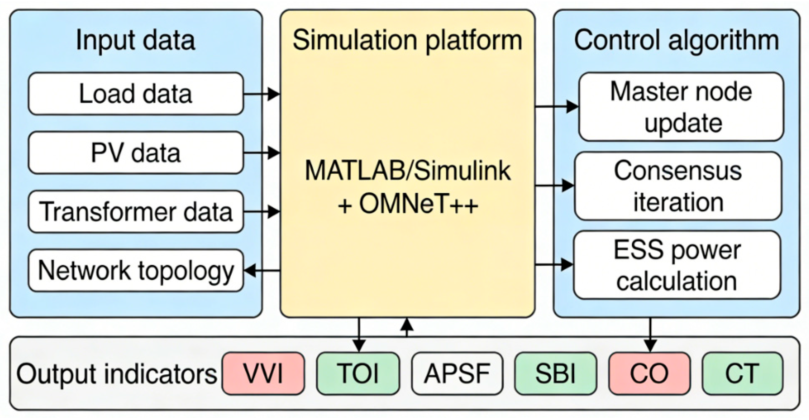Figure 1 illustrates the overall validation structure of the proposed method. The simulation framework integrates three main components: input data acquisition, distributed control algorithm implementation, and performance evaluation. The input data includes load profiles, PV generation data, transformer measurements, and communication network topology. The control algorithm is implemented in MATLAB/Simulink, with communication protocols emulated in OMNeT++.