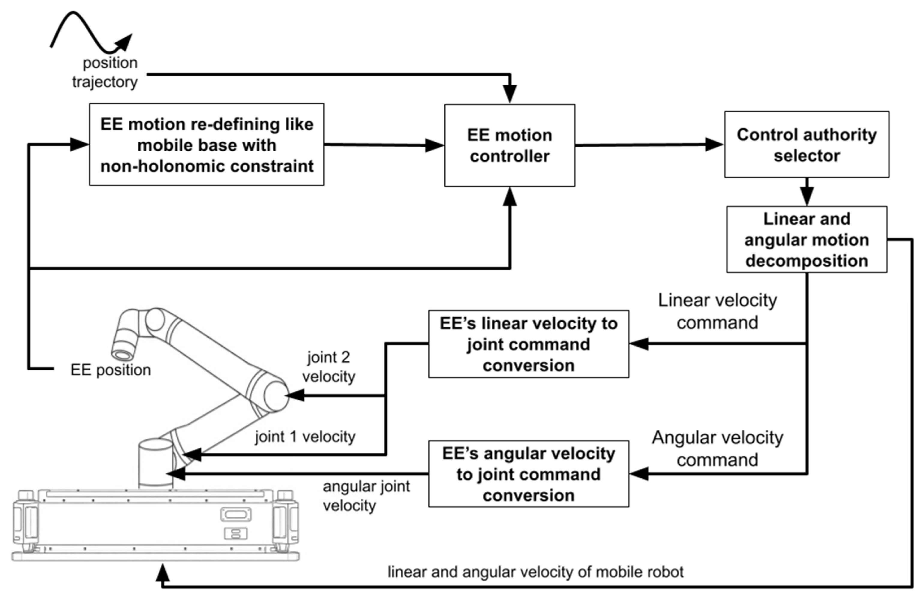 As shown in (2), both vε and ωε are expressed as combinations of the velocity components of the mobile base and the manipulator. Therefore, redundancy must be addressed when controlling the EE. A control authority switching algorithm is proposed to resolve the redundancy issue.