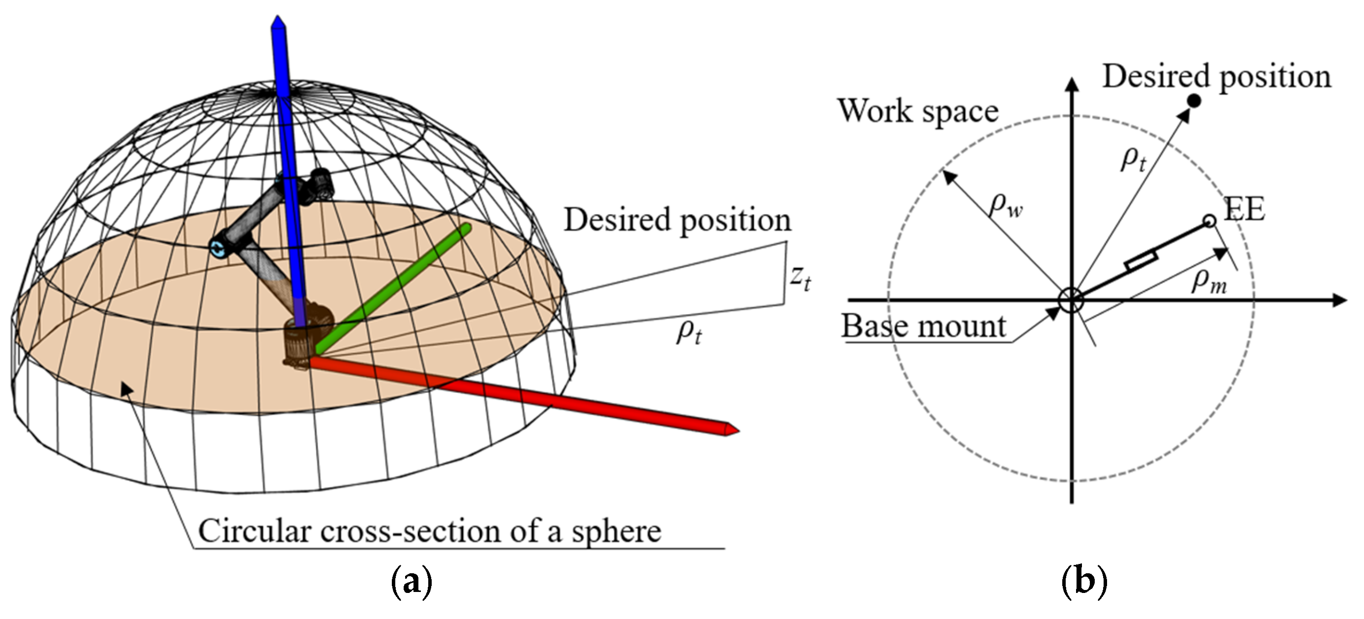 Note: The switching point s determines the balance of control authority between the mobile base and the manipulator. When s is set close to ρw, the manipulator-only control region is maximized, but the EE is more likely to approach the workspace boundary, increasing the risk of joint velocity saturation and kinematic singularity. Conversely, when s is set close to zero, the mobile base is activated excessively, leading to unnecessary base motion and energy inefficiency. In this study, s is set to ρw/2, which equally distributes the control authority between the two subsystems: the manipulator primarily handles tracking when ρt < s, while the mobile base progressively participates as ρt exceeds s. Since ρw varies with the target height according to (18), s adapts automatically to the three-dimensional workspace geometry. Combined with α = 5.0, this configuration produces a smooth transition zone of approximately ±20% of ρw, preventing both abrupt mechanical shock and excessive response delay. The user may increase s when the trajectory remains within the workspace or decrease it when early base activation is desired. For example, when s is set to a smaller value, the active range of the mobile base is expanded, causing the base to move even when the desired position lies within the reachable workspace of the manipulator. This configuration is advantageous in scenarios where minimizing manipulator joint motion is desired or where maintaining a compact arm posture during base transit is preferred. Conversely, when s is set to a larger value, the operational range of the manipulator is extended, allowing the robot to reach targets by extending its arm while the base is in motion. This is beneficial in confined environments or in situations where precise repositioning of the base incurs a high cost.