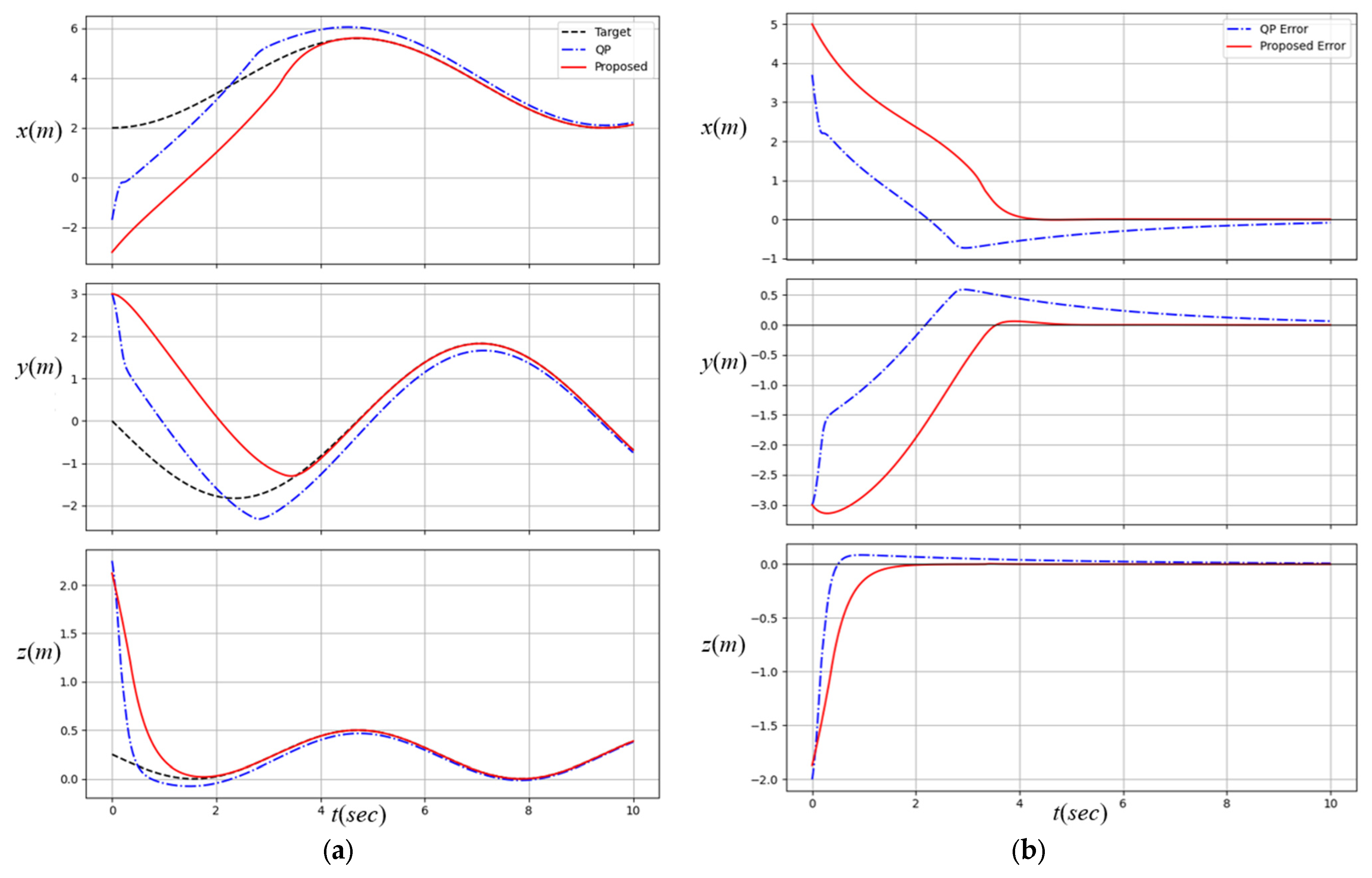 13]. It should be noted that both the proposed method and the QP-based controller are designed to achieve the same control objective, namely, to minimize the EE position error with respect to the desired trajectory in three-dimensional space. Both methods operate under the same target trajectory, the same initial conditions, and the same system parameters as specified in