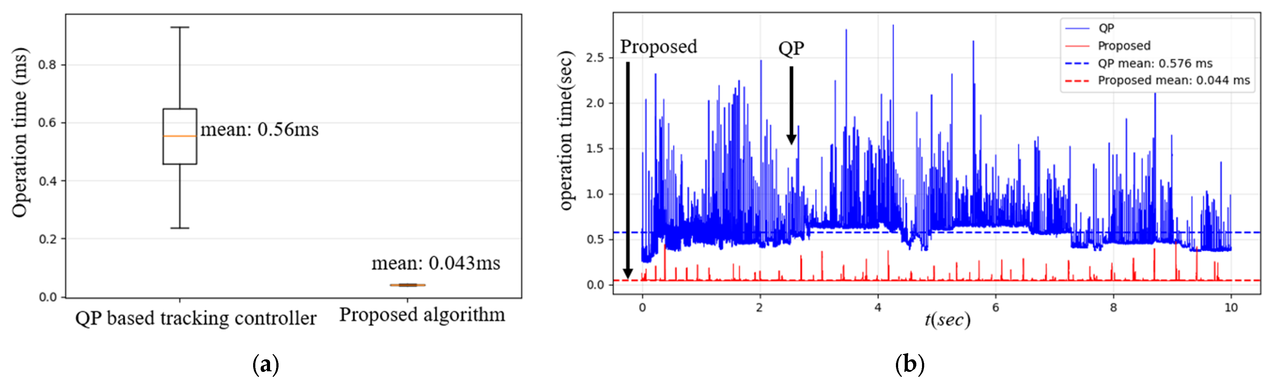 Figure 6 presents a comparison between the proposed algorithm and the QP-based control method in terms of computational time. From the perspective of computation, the difference between the two approaches is more pronounced. For the proposed algorithm, the average computation time per control loop is more than 13 times faster than that of the optimization-based method, and the variation in computation time throughout the entire simulation interval is very small. This improvement is attributed to the reduced control complexity achieved by the proposed framework. In contrast, the QP-based controller must solve an optimization problem at every control cycle, resulting in a larger average computation time and the potential for occasional computation-time spikes in worst-case scenarios. When the computation times shown in