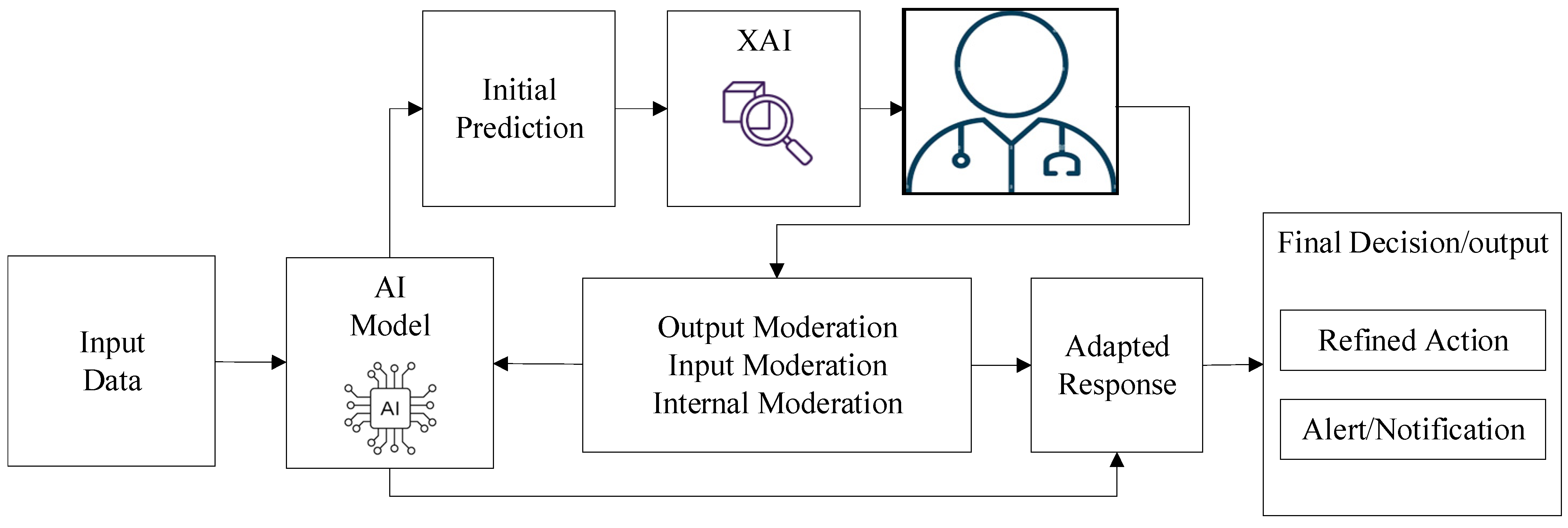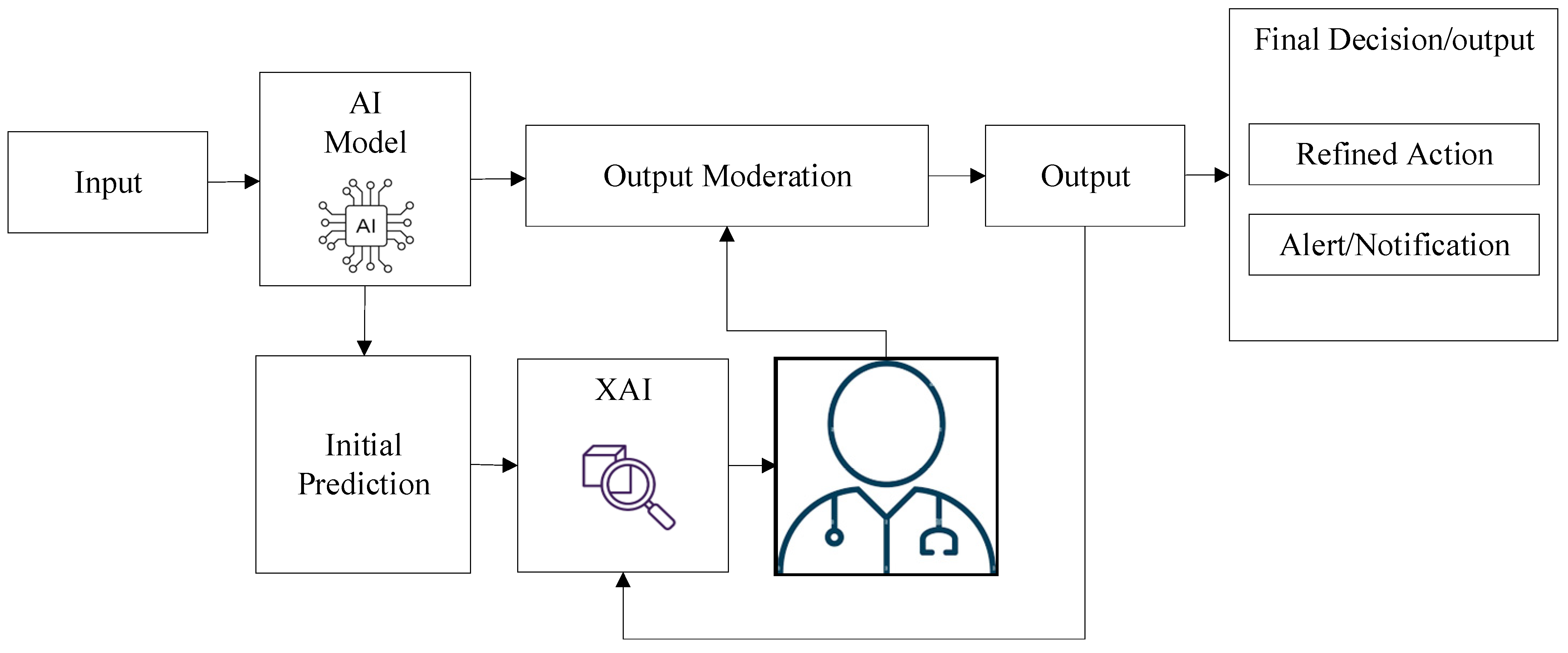 - Output moderation, where clinicians review and adjust model predictions before they are used in decision-making.