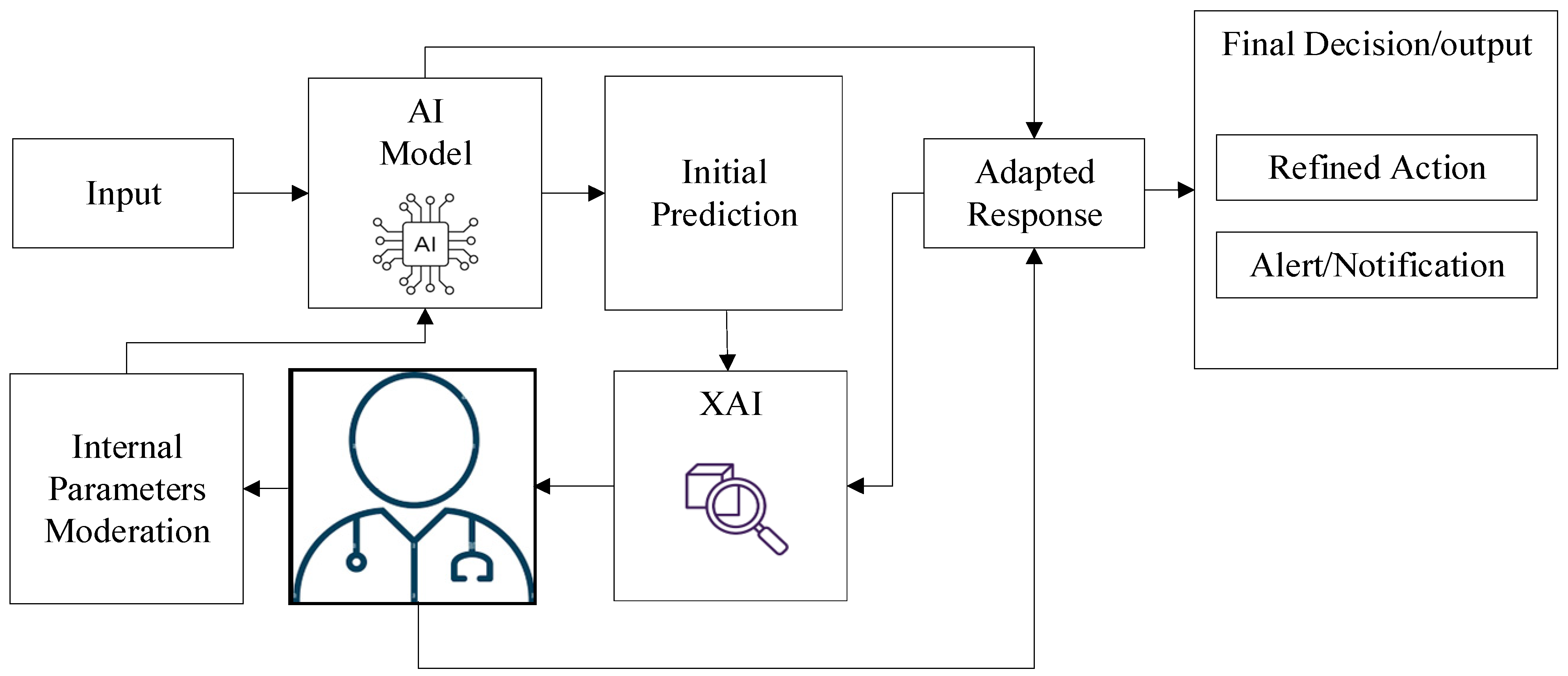 | Without model Retraining (Override) | [92,93,94,95,96,97,98,99,100,101] | Real-time adaptation, lower computational burden, rapid feedback integration, improved safety and control, simpler regulatory compliance as the core model is unchanged, clinician trust and oversight | Increased cognitive load, risk of feedback fatigue, and inconsistent handling of edge cases |