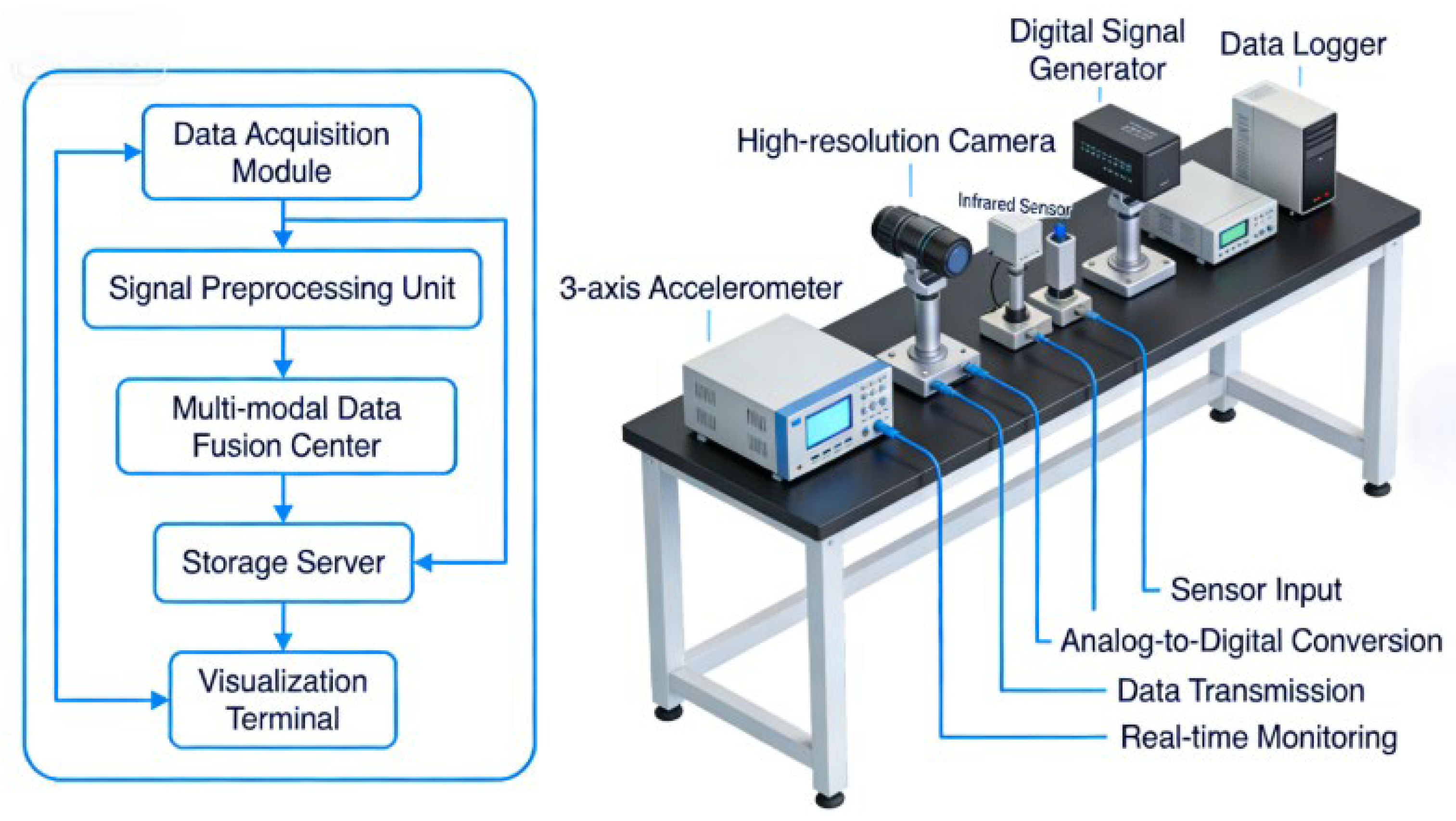 11], consisting of an engine test bench, multi-modal sensing equipment, environmental noise simulation hardware, and a high-precision data synchronization card. The overall platform architecture is illustrated in
