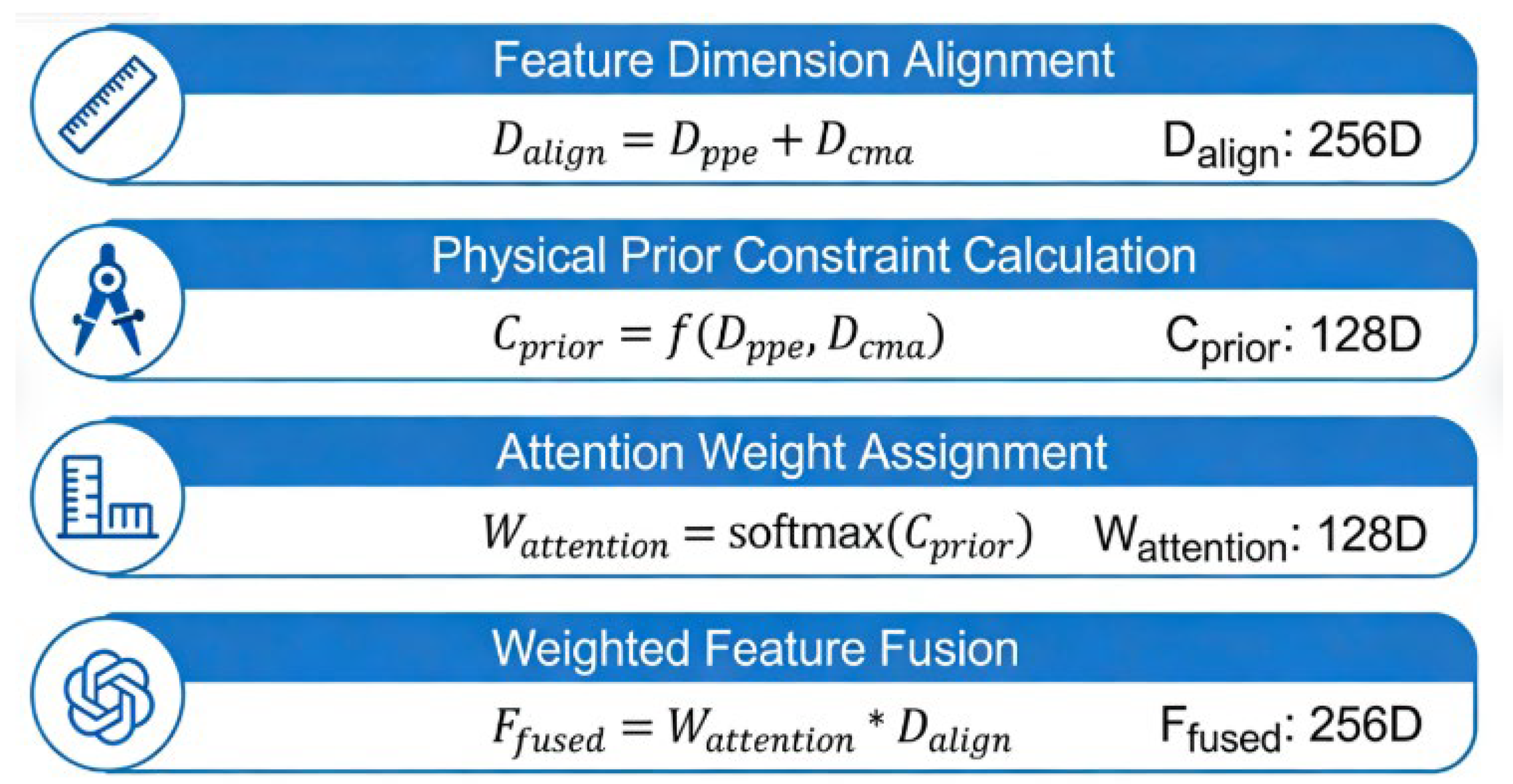 To solve the problem of low fusion efficiency caused by the lack of physical correlation mining in traditional cross-modal fusion methods, a PPE-CMA fusion module was designed to realize adaptive and efficient fusion of audio and image features. A detailed theoretical derivation of the module is presented in this section, including the physical meaning of cosine similarity in engine fault diagnosis and the rationality of the attention weight constraint β = 1 − α. The core idea of the module is to take the physical coupling relationship between engine fault acoustic and visual characteristics [