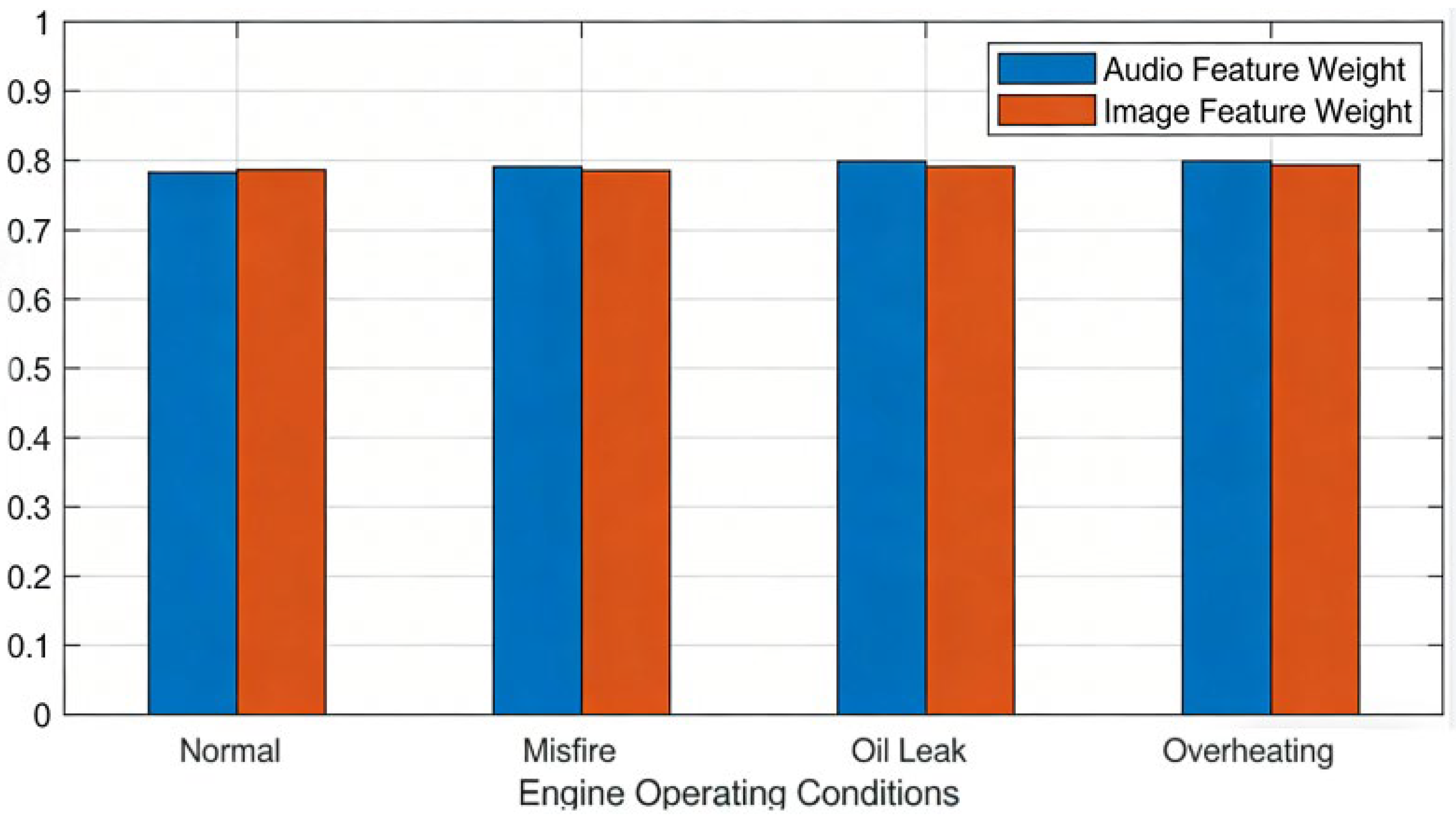 For faults with obvious acoustic characteristics (e.g., valve abnormal sound), the cosine similarity is high, and α is assigned a larger value, so that audio features play a major role in classification. For faults with obvious visual characteristics (e.g., connecting rod bearing abnormal sound), the cosine similarity is low, and β is assigned a larger value, so that image features play a major role in classification. For composite faults with both obvious acoustic and visual characteristics, the cosine similarity is close to 0.5, making α ≈ 0.5 and β ≈ 0.5, so that both modalities contribute equally to classification.