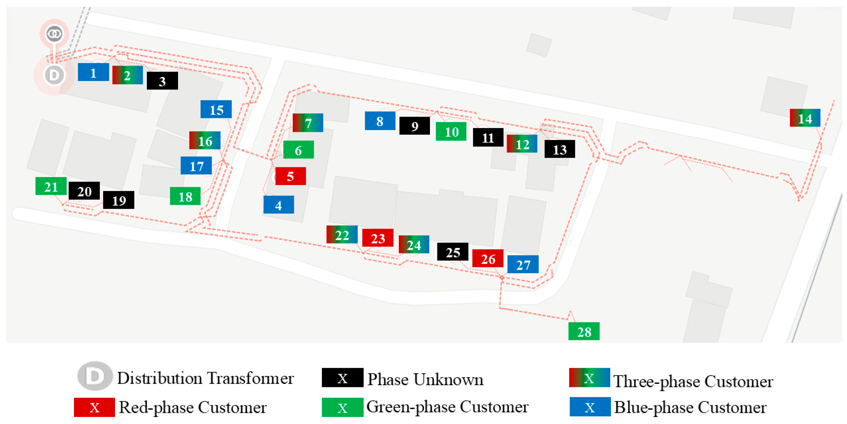 Figure 1. The DN consisted of one distribution transformer and two radial LV feeders. The DN had a total of 28 users (customers) distributed along two LV feeders, with