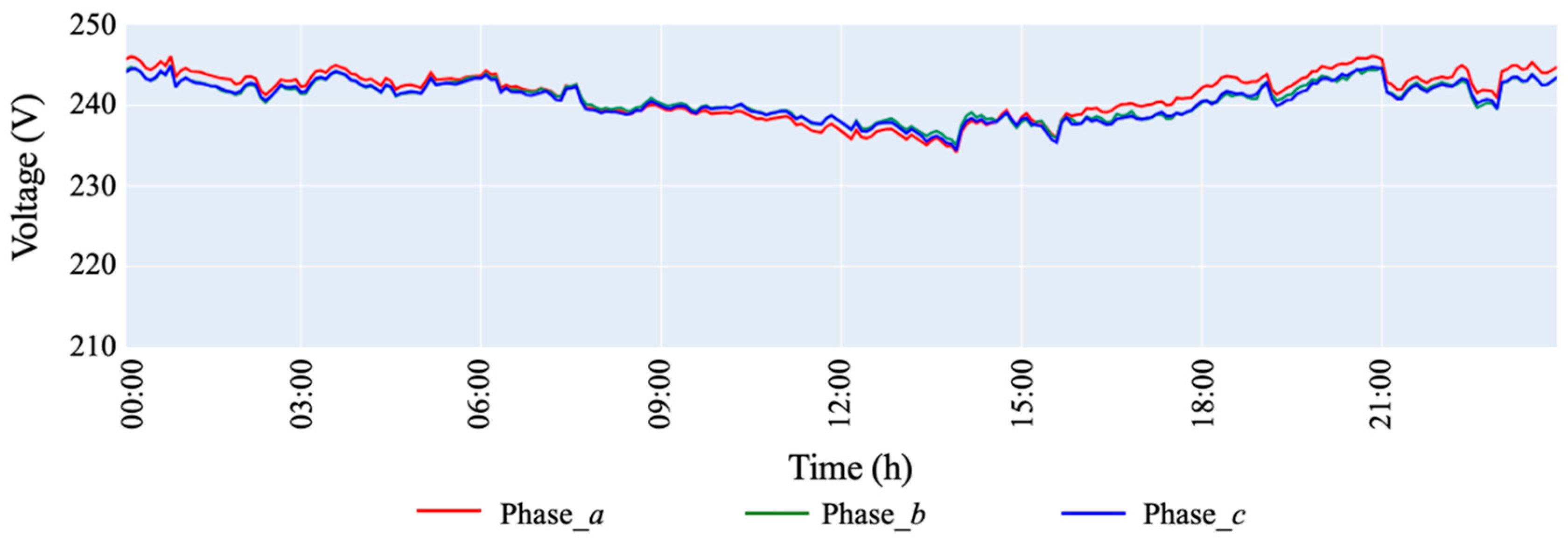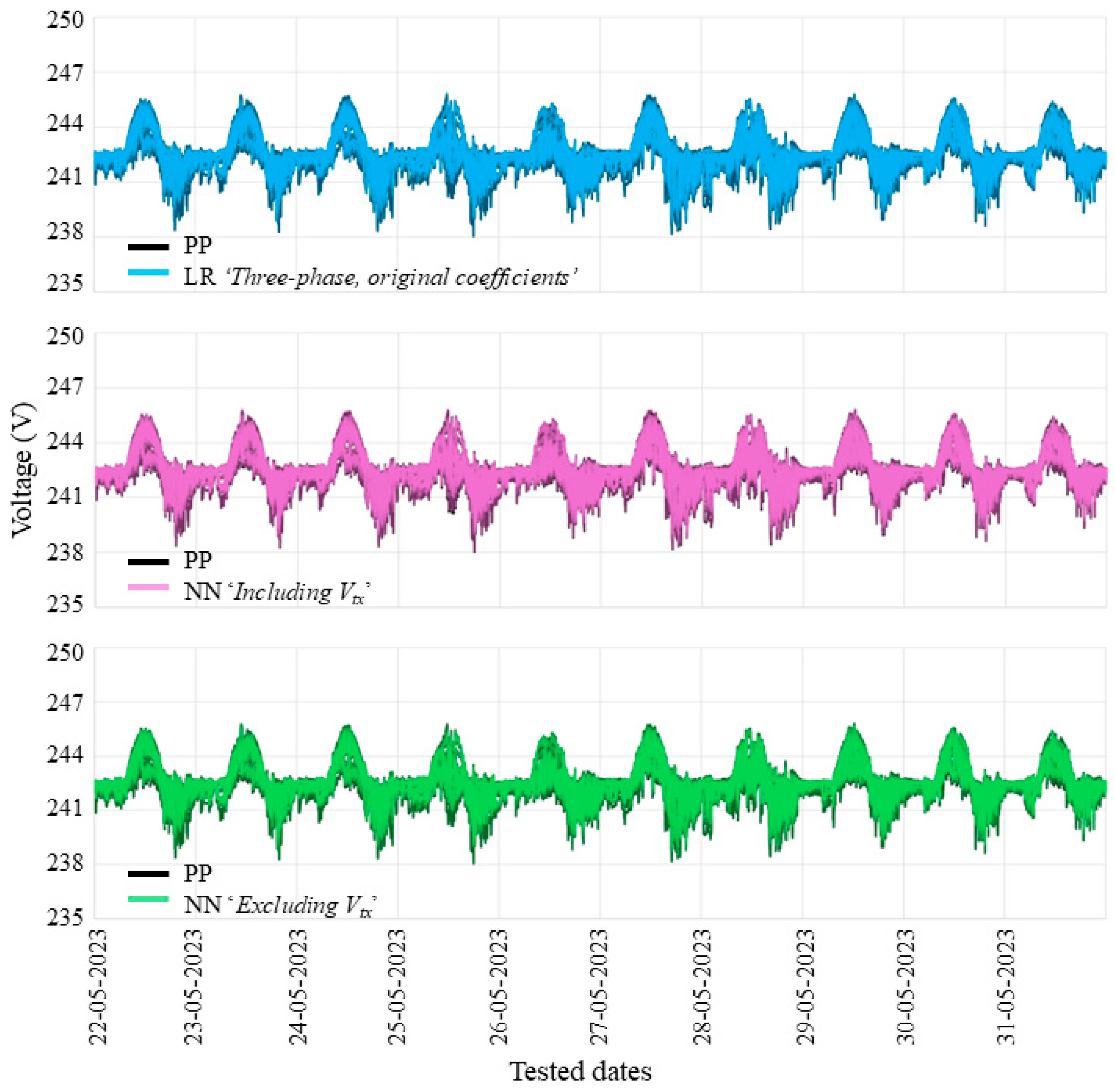 The LR model ‘Three-phase, original coefficients’, developed on three-phase basis without forcing coefficients to be positive, produced comparatively the best voltage predictions from the proposed LR approach. It accurately followed the PP simulations with almost negligible errors for all four selected months. For example, it had an R2 of 0.9998, RMSE of 0.01 V and MaxAE of 0.11 V for the month of May 2023. It was evident that, as the voltage variation at users increased or as the line impedance increased down the feeders, the voltage prediction accuracy of proposed LR models slightly reduced. Moreover, the two NN models identified as best-performing under the conditions ‘Including Vtx’ and ‘Excluding Vtx’ were able to effectively follow the PP simulations with respective MaxAEs of 0.15 V and 0.13 V and same RMSE of 0.02 V. Additionally, the simulation of LR and NN models demonstrated significant efficiency compared to PP model.