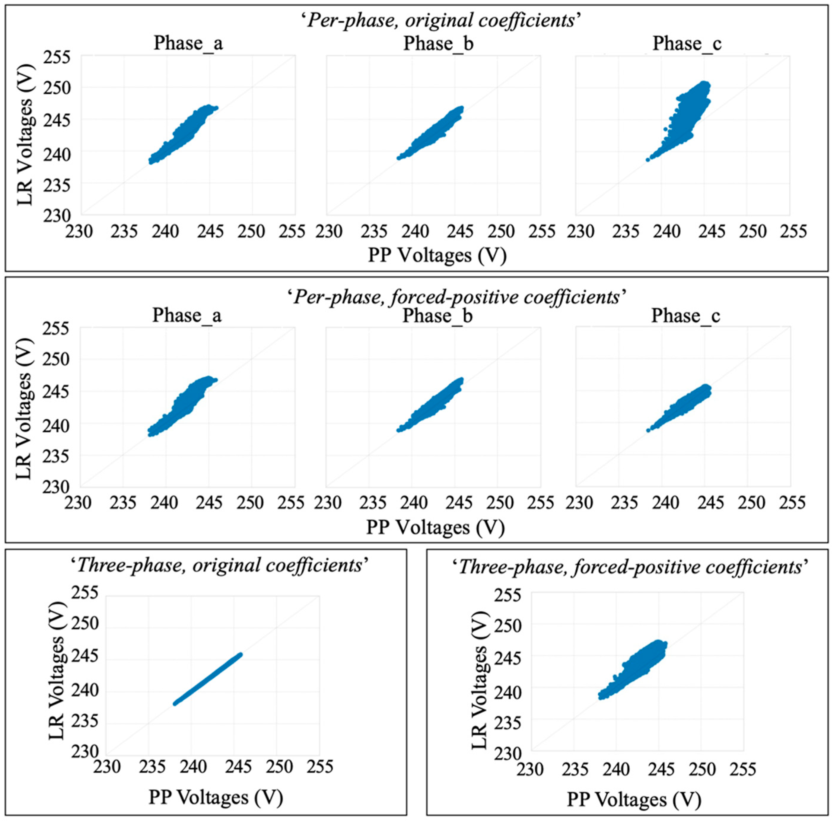 Three-phase, forced-positive coefficients’, the markers got more dispersed from the diagonals as the voltages increased, indicating that their predictions deviated more from the PP simulation results as the voltages increased.
