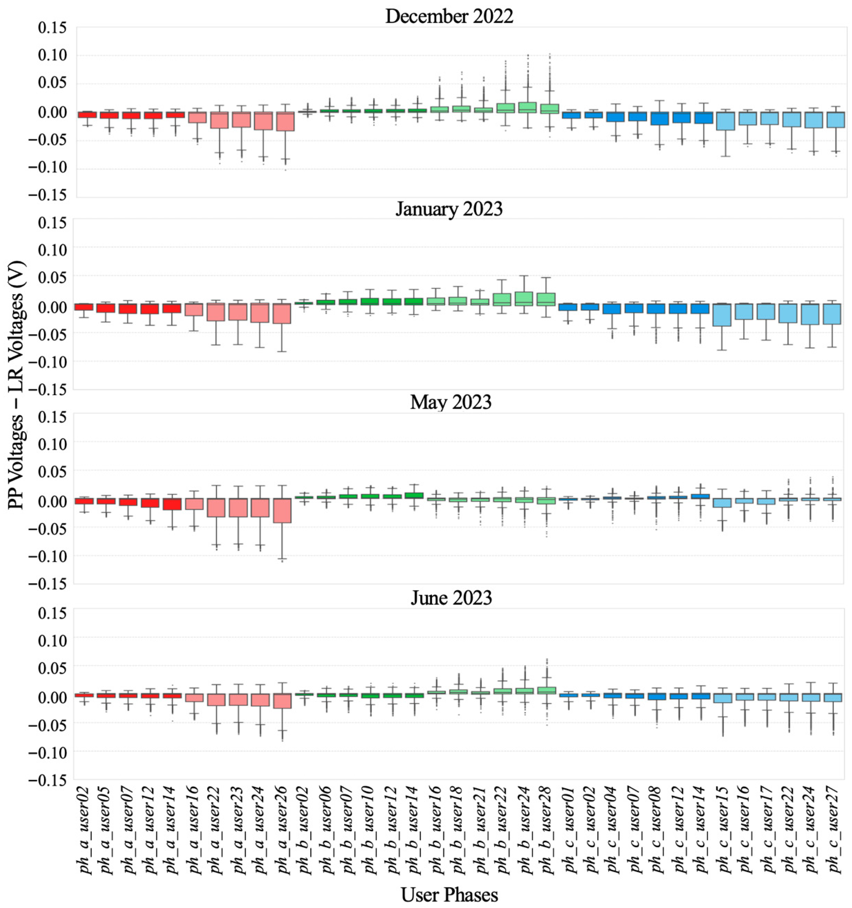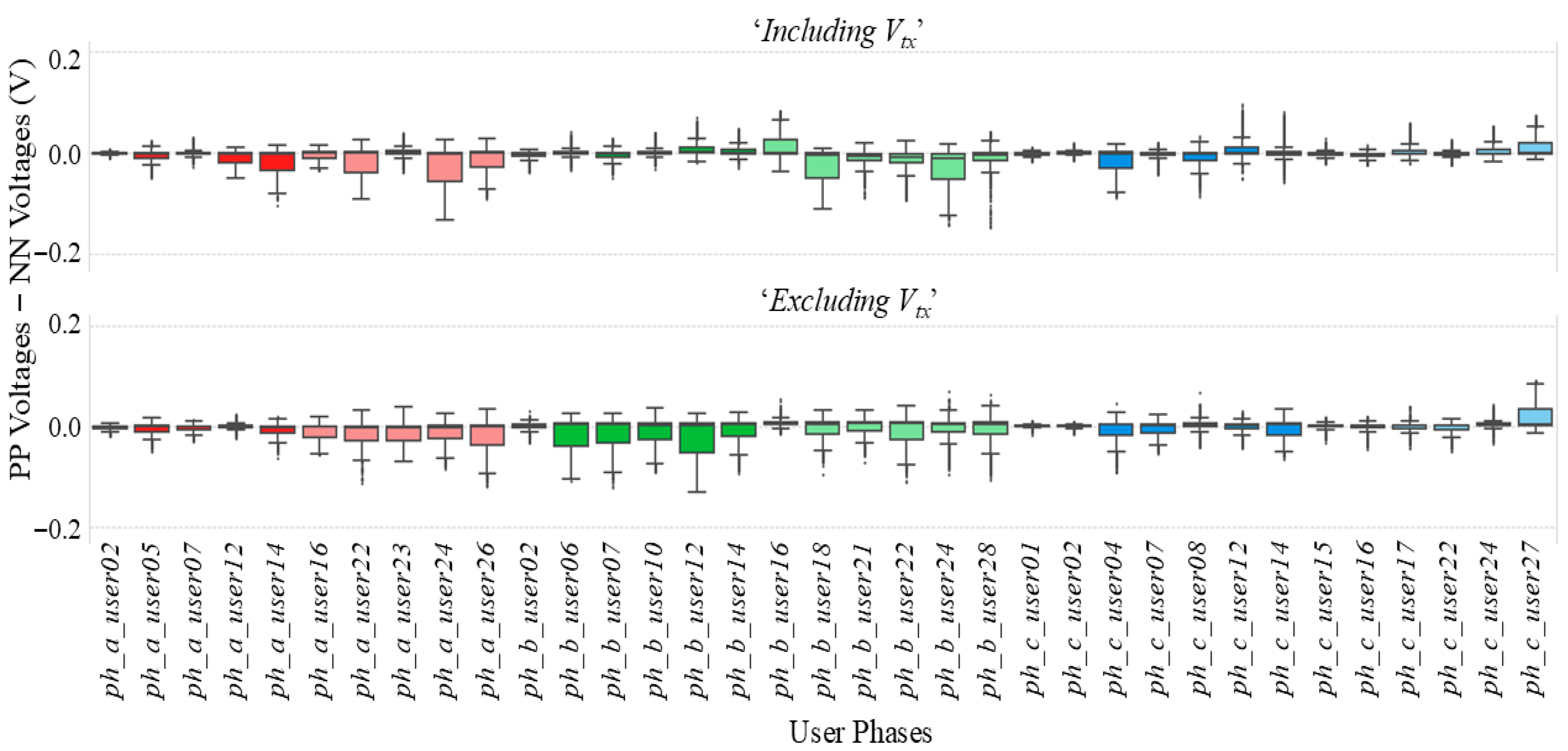 Figure 10 depict the spread of errors between simulated PP voltages and predicted NN voltages (PP voltages–NN voltages) encountered by each user phase under the conditions ‘
