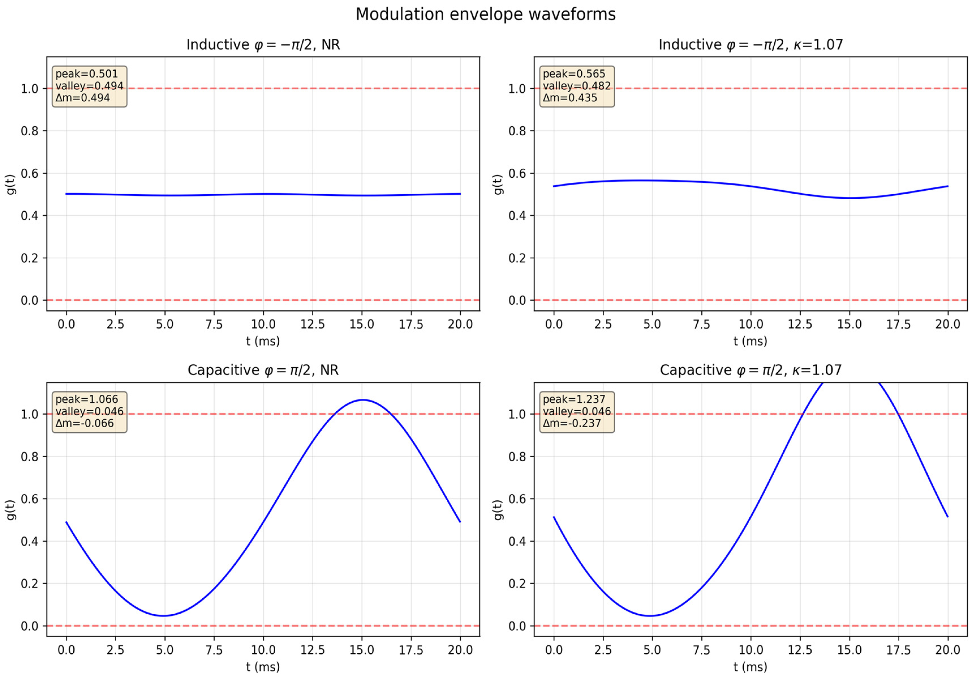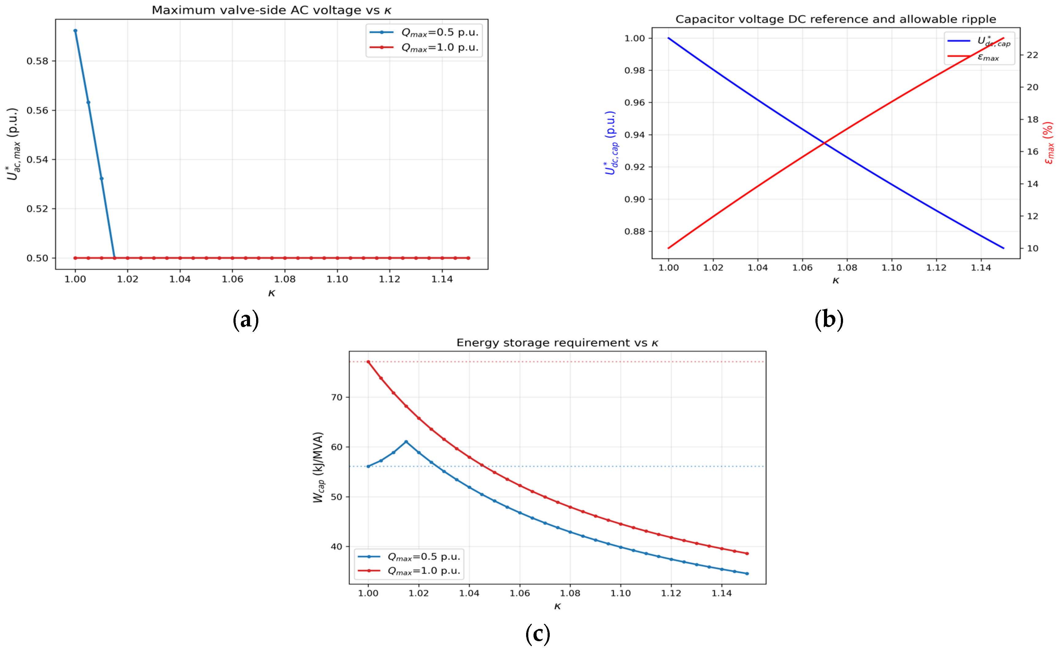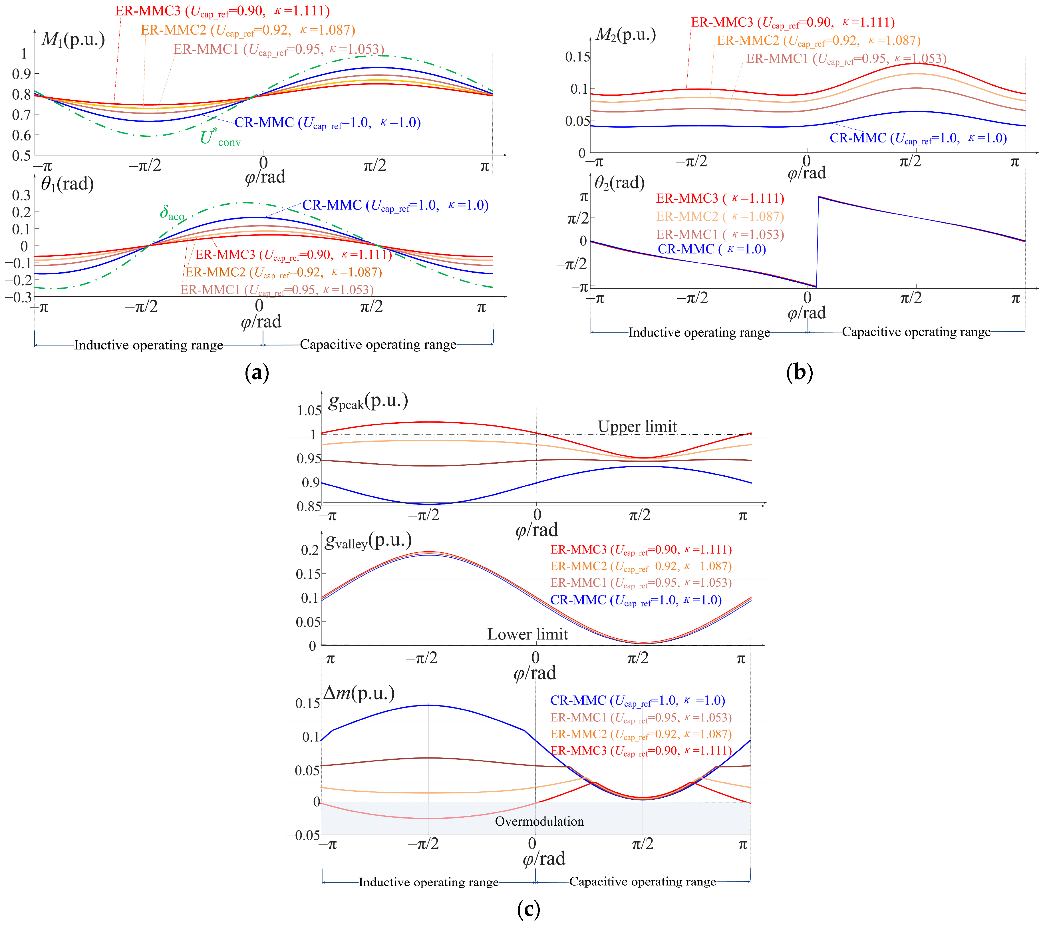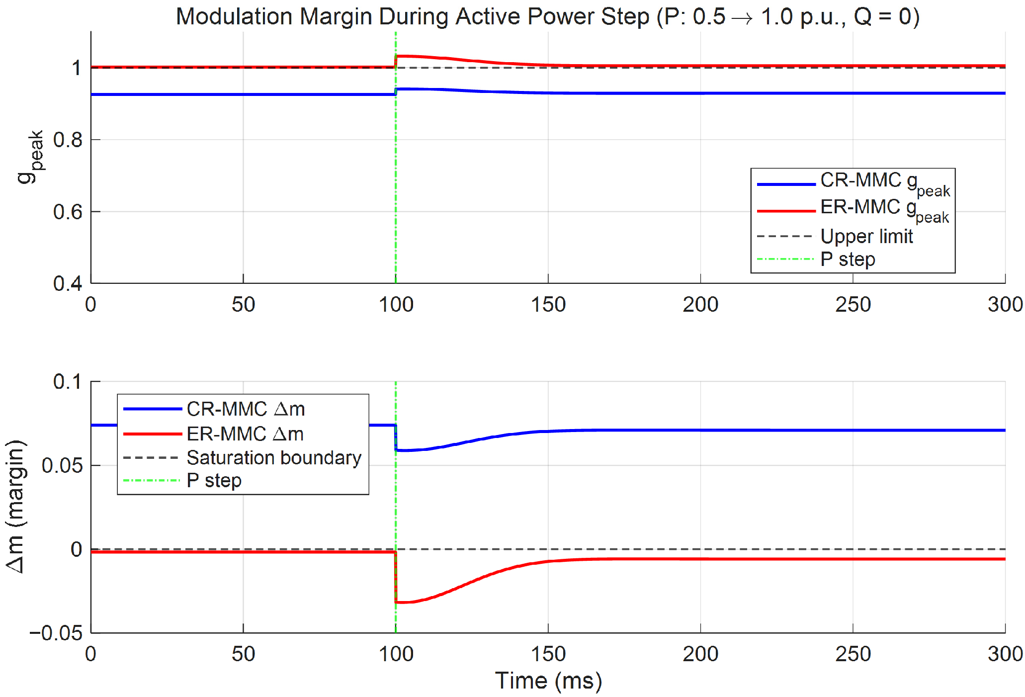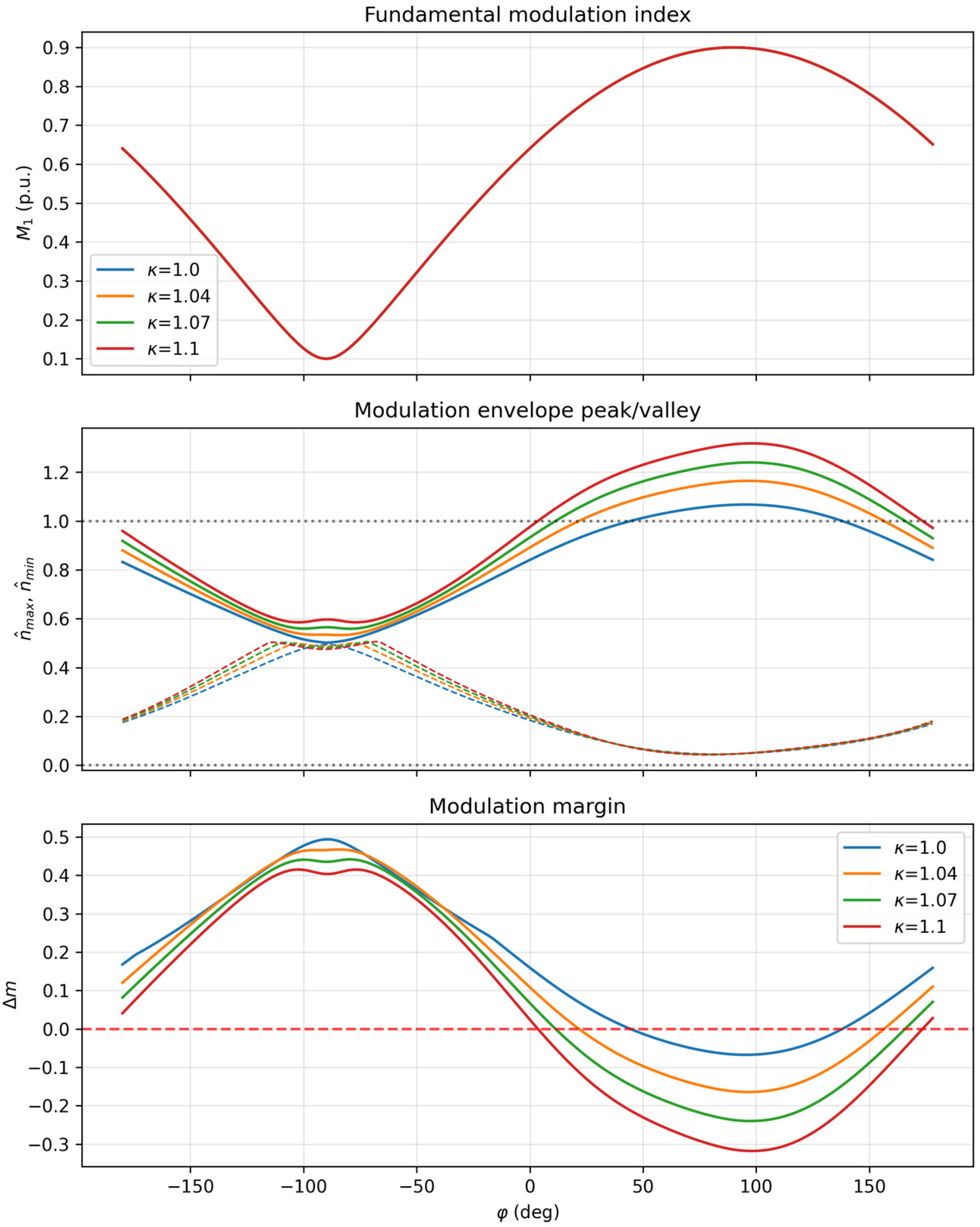 - An analytical framework is developed to evaluate the modulation boundary under elevated ripple. A modulation envelope function g(t) is defined that incorporates the CVR effect and the second-harmonic reference from circulating-current suppression control (CCSC). The framework enables accurate determination of the maximum achievable valve-side AC voltage across the entire PQ operating range.