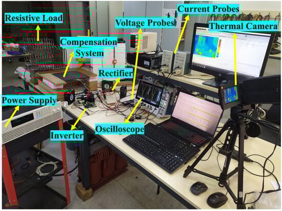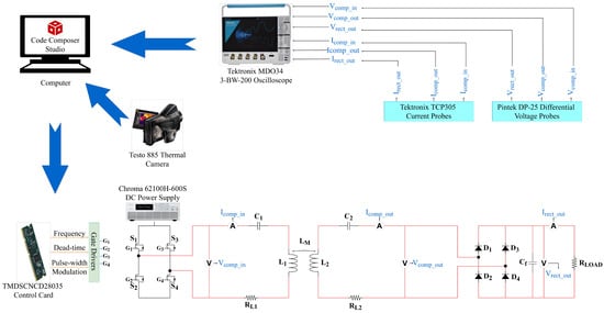 The experimental setup is shown in Figure 5. The TDINV3500P100-KIT model, a single-phase, high-frequency full-bridge inverter with 3.5 kW power and a 150 kHz frequency range, was used at the beginning of the WPT system. Frequency, duty cycle, and dead time parameters were set using the F28035 Piccolo control card within the inverter. TP65H070G4PS gallium nitride (GaN) FETs are used as switching elements in the inverter. These switching elements have lower resistance than their silicon carbide (SiC) counterparts, offering more efficient switching and wider frequency operation. Energy to the inverter was provided by the Chroma 62100H-600S programmable DC power supply, which has a 600 V, 17 A, 10 kW rating. The compensation system consists of capacitor banks and coils with circular, rectangular, and DD geometries. In this study, since WPT via magnetic resonance was adopted, capacitor banks were designed in accordance with the coupler pairs. Thus, the voltage stress on the capacitors decreased. In all coil designs, 2.4 mm diameter, 38 AWG Litz wire consisting of 300 twisted wires was used. In the full-wave rectifier stage, APT30S20B(G) model high-voltage Schottky diodes with 200 V, 45 A ratings were used. In the last stage, a 5 Ω load consisting of a series of resistors was used. Tektronix TCP305 differential current and Pintek DP-25 differential voltage probes were used to measure voltage, current, and power ratings of the subsystems. Ratings regarding wireless power transfer were recorded by observing current, voltage and power signals with a Tektronix MDO34 oscilloscope. In this way, the total efficiency (DC-DC) of the WPT system was obtained by measuring the input power of the system and the output power on the load in terms of real power (W). AC-AC efficiency is the compensation system efficiency and was determined from apparent power (VA) measurements at the input and output of the compensation system. The inverter and full-wave rectifier are cooled by fans for improved efficiency. The WPT system temperatures were monitored and recorded by a Testo 885 thermal camera, and the effects of subsystem temperatures on efficiency were investigated.