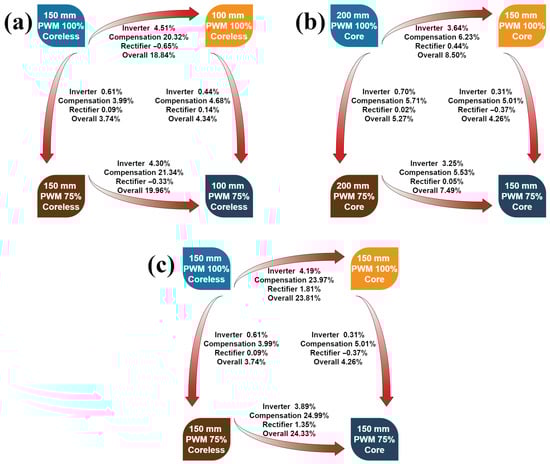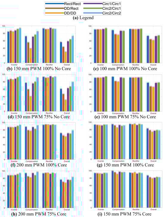 To illustrate the efficiency analysis of the components of the WPT system, the average changes in the inverter, compensation, rectifier, and total efficiencies across the air gap, duty cycle, and magnetic core triangle are presented in an infographic in Figure 7. The results are summarized below.