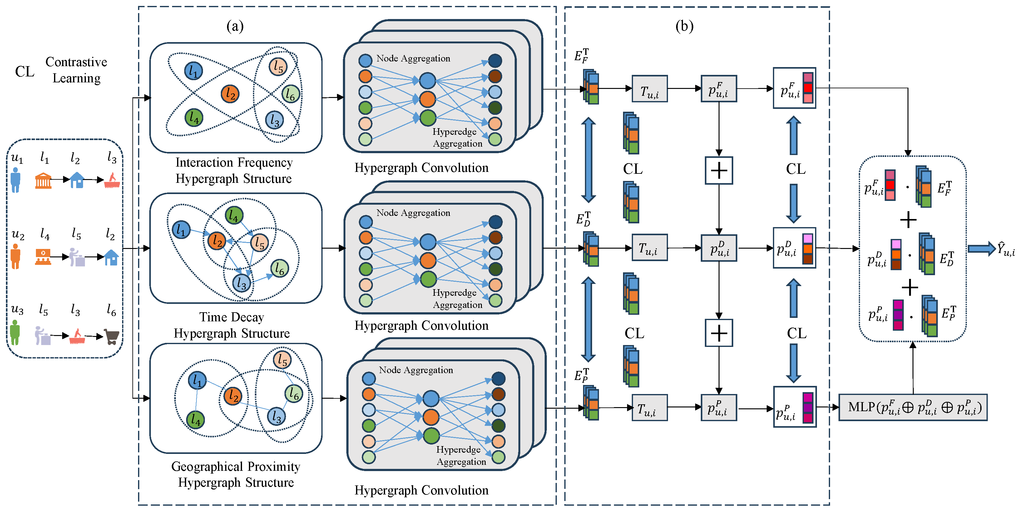 Illustration of the proposed framework MRHL. (a) Hypergraph learning for interaction frequency, time decay, and geographical proximity. (b) Cascaded enhancement fusion & cross-view contrastive learning.