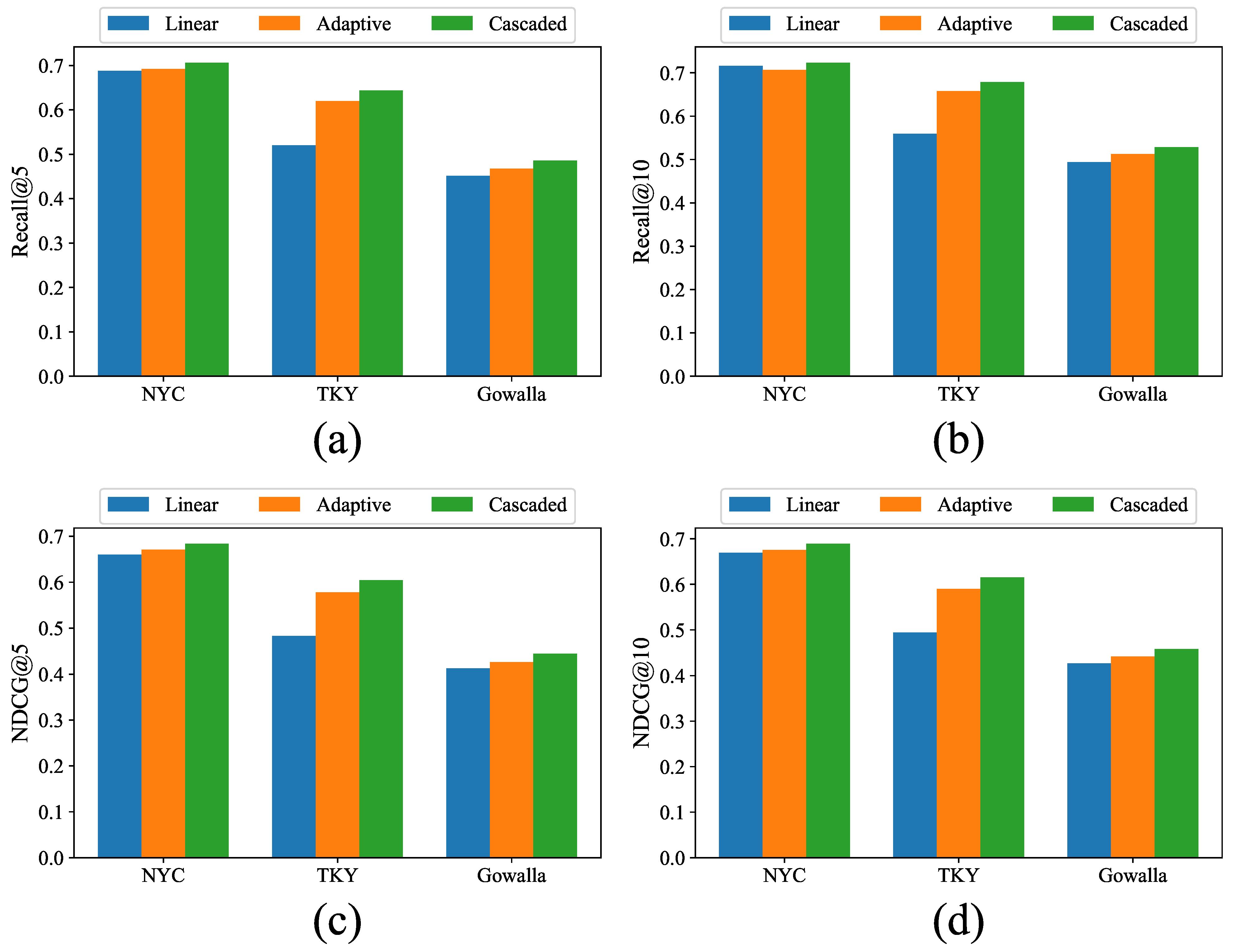 On the NYC dataset with the highest density, all fusion methods achieve strong performance. Nevertheless, cascaded fusion consistently outperforms both linear and adaptive fusion across all evaluation metrics. This suggests that even simple fusion remains competitive in dense data, while the cascaded design offers additional advantages. For the TKY dataset with moderate density, adaptive fusion already surpasses linear fusion, reflecting the benefit of dynamically adjusting the contributions of different components. However, cascaded fusion further improves performance on all metrics, indicating that the cascaded strategy enhances robustness and more effectively leverages intermediate signals. On the sparser Gowalla dataset, the performance gaps among methods become most pronounced. Linear fusion performs the weakest, while adaptive fusion yields moderate improvements. In contrast, cascaded fusion achieves the highest scores across all evaluation metrics. These results highlight that the cascaded design is especially effective in sparse data, where higher-order collaborative signals are crucial.