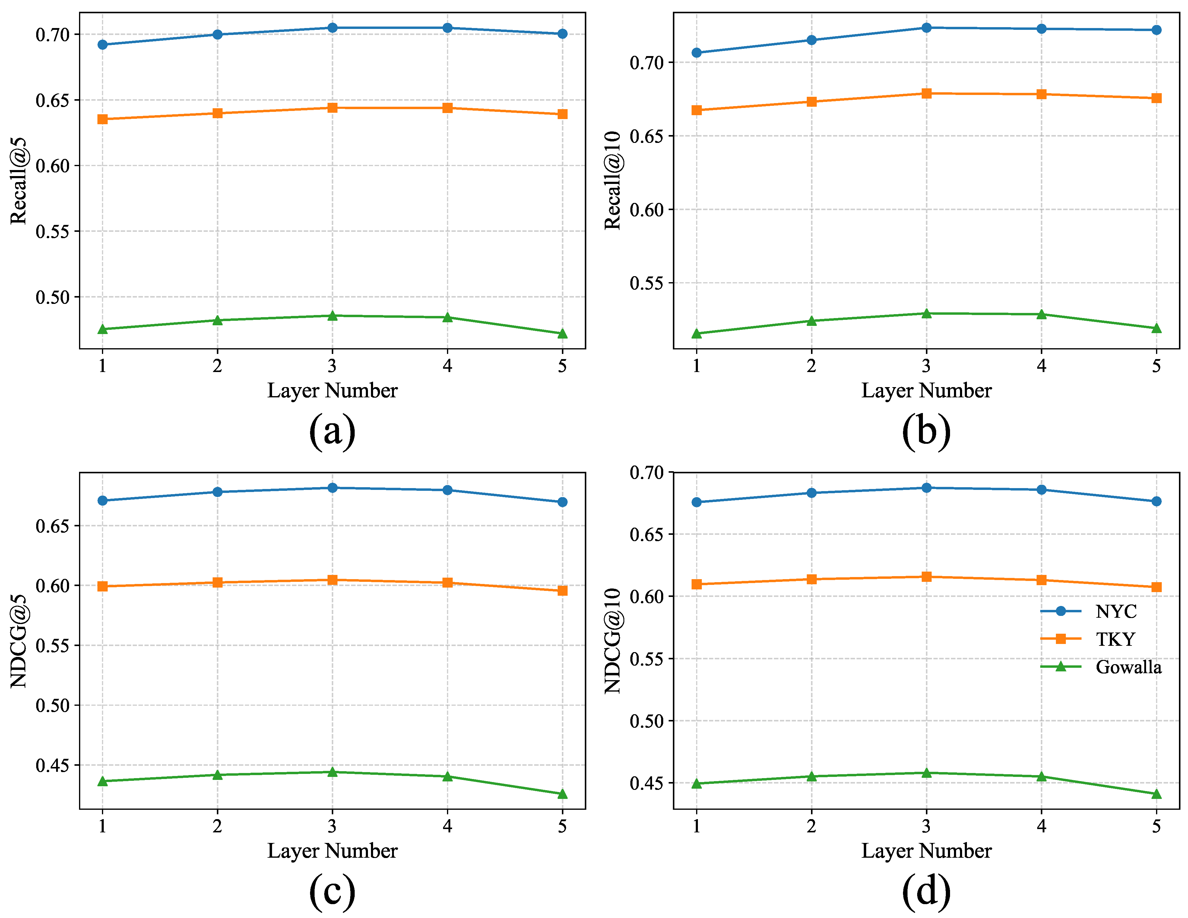 Figure 3 depicts the performance trends with varying layer numbers on three datasets. As the depth increases from 1 to 3, all metrics (Recall@5/10 and NDCG@5/10) consistently improve, demonstrating the benefit of capturing higher-order dependencies through deeper propagation. However, beyond three layers, the curves either slightly decline or plateau, suggesting that excessive depth introduces redundant information and oversmoothing, which undermine discriminative capacity. This suggests that