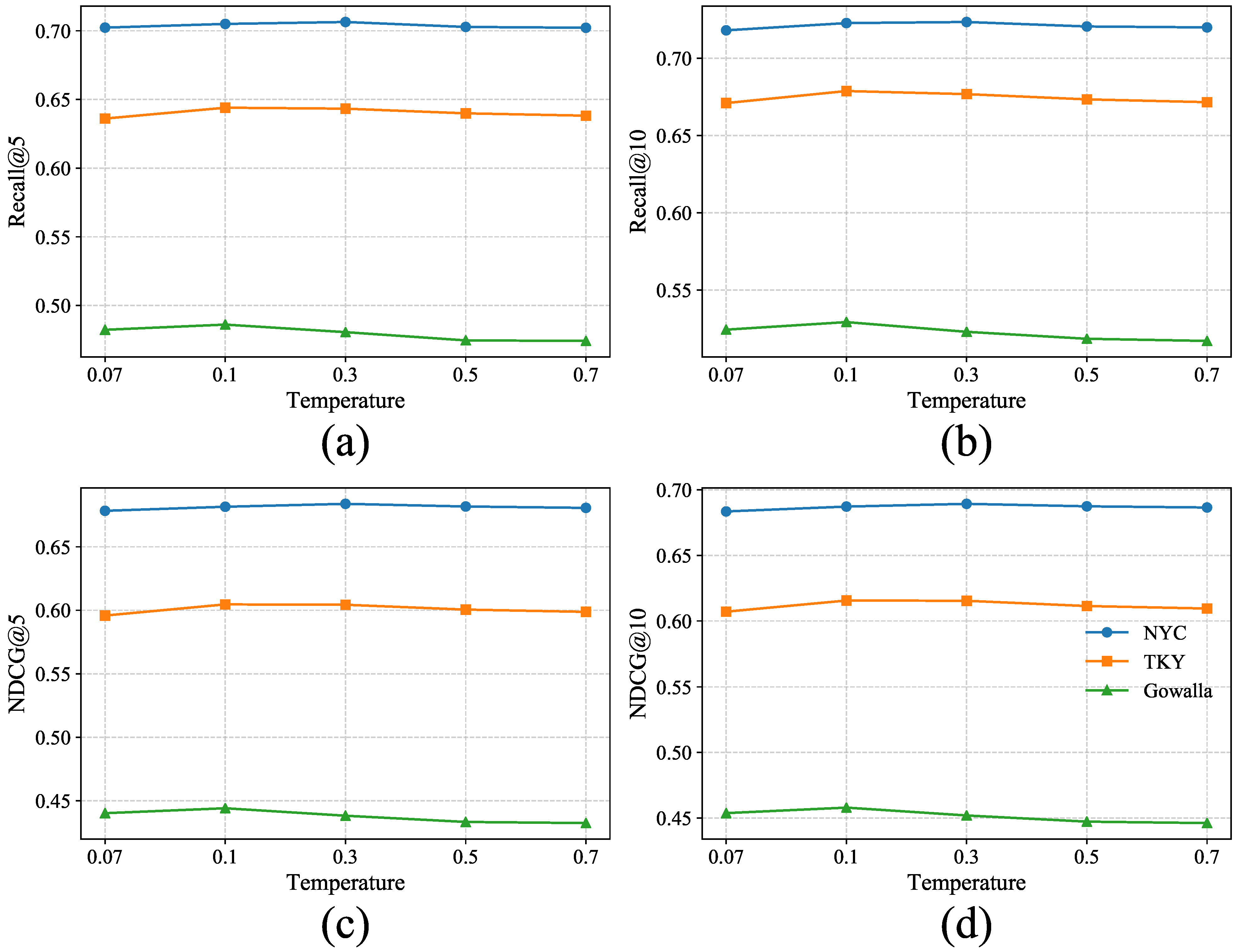 All experiments are conducted on an NVIDIA 3080Ti GPU using the PyTorch (version 2.8.0) framework. For the baseline methods, we adopt the parameter settings reported in the original papers and perform hyperparameter tuning on the three datasets. For training the MRHL model, we employ the Adam optimizer with a learning rate of and weight decay of . The embedding dimension for users and POIs is set to , and the batch size is fixed at 1024. For data preprocessing, the order of the auto-regressive model is set to 100. For trajectories longer than this threshold, only the most recent 100 POIs are retained to preserve the latest user preferences. For shorter sequences, zero-padding is applied to ensure uniform input dimensions for efficient batch computation. Following prior empirical settings, the distance threshold is set to 1 km. The number of convolutional layers is tuned from , and the temperature parameter is tuned within . The regularization weight is set to , and the balance coefficient is fixed at 0.1.